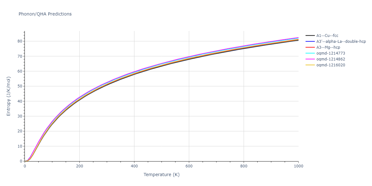 The Gibbs energies of the phases are estimated using thermodynamic integration between the interatomic potential in question and a simpler model with known Gibbs free energy values. For solids, the reference model is an Einstein solid, while for liquids it is the Uhlenbeck-Ford potential. Besides a short run at the start of the solid calculations to estimate Einstein model spring constants, the two calculations proceed similarly. Starting with the final relaxation configurations, the systems are stabilized for 25,000 steps. Then, over the next 50,000 steps the potential is swapped out for the reference potential. The system is then stabilized for another 25,000 steps with the reference model before a reverse swap of 50,000 steps is performed. The simulation ends with one final 25,000 step stabilization period. From the simulation, the irreversible work of transformation is estimated and used to compute the absolute Gibbs free energy of the target phase and potential relative to the reference potential. Entropy is estimated as the difference in enthalpy and Gibbs free energy and divided by temperature.
