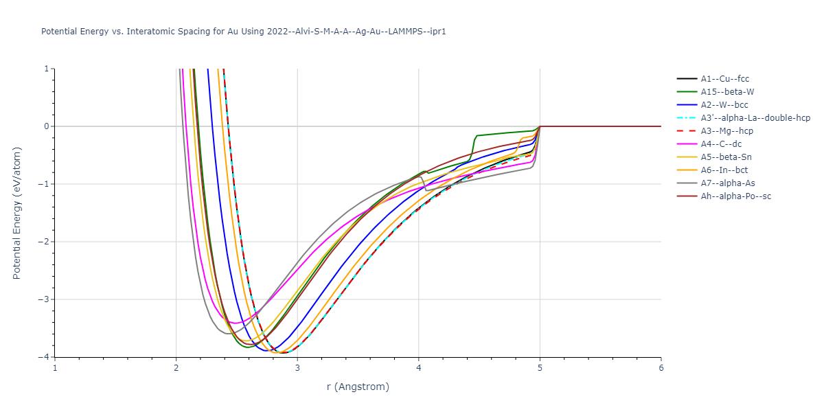 Plots of potential energy vs interatomic spacing, r, are shown below for a number of crystal structures. The structures are generated based on the ideal atomic positions and b/a and c/a lattice parameter ratios for a given crystal prototype. The size of the system is then uniformly scaled, and the energy calculated without relaxing the system. To obtain these plots, values of r are evaluated every 0.02 Å up to 6 Å.