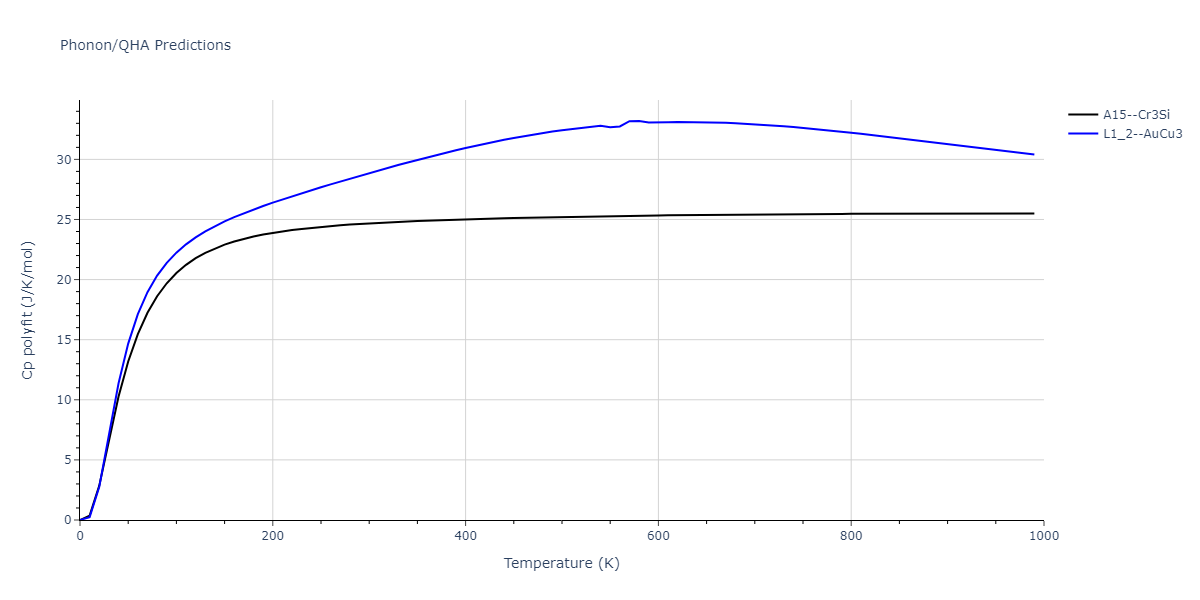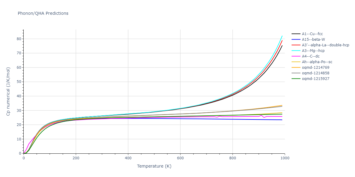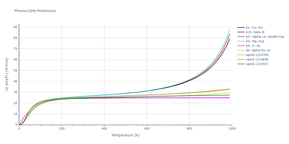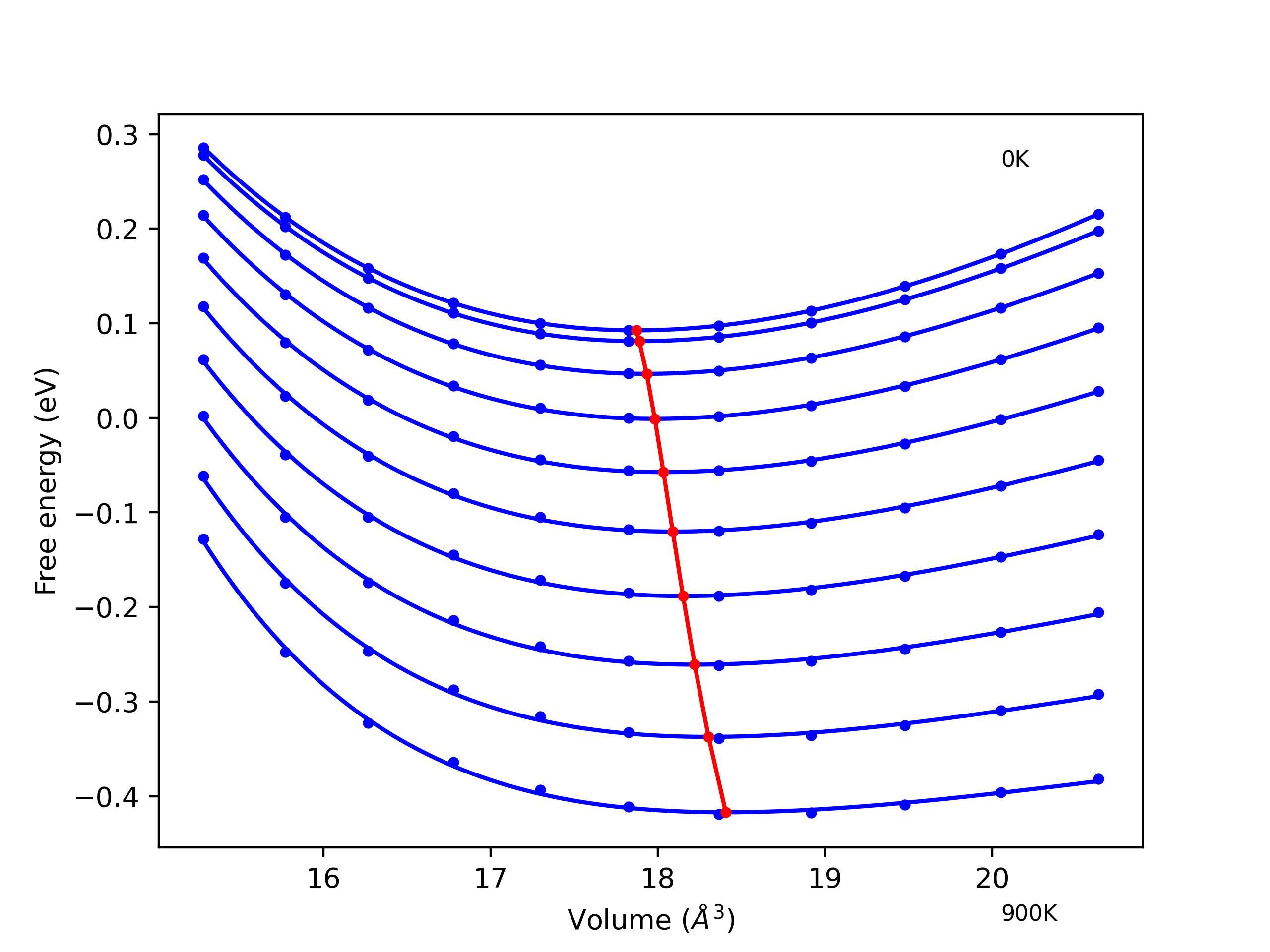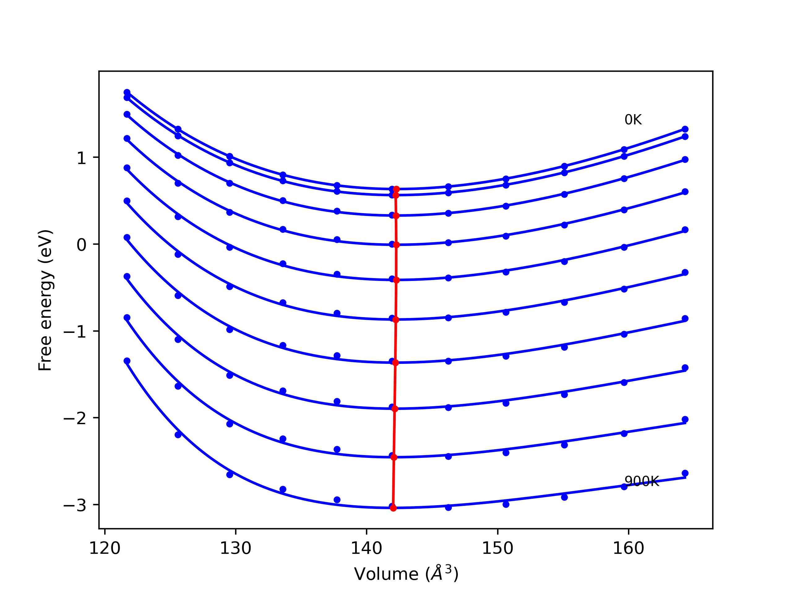 • The thermodynamic properties estimated from QHA are based on the assumption that only volumetric changes affect the phonon behaviors as the temperature changes. This tends to give good predictions at lower temperatures but ignores anharmonic effects such as phonon coupling and vacancy formation that can be important at higher temperatures.