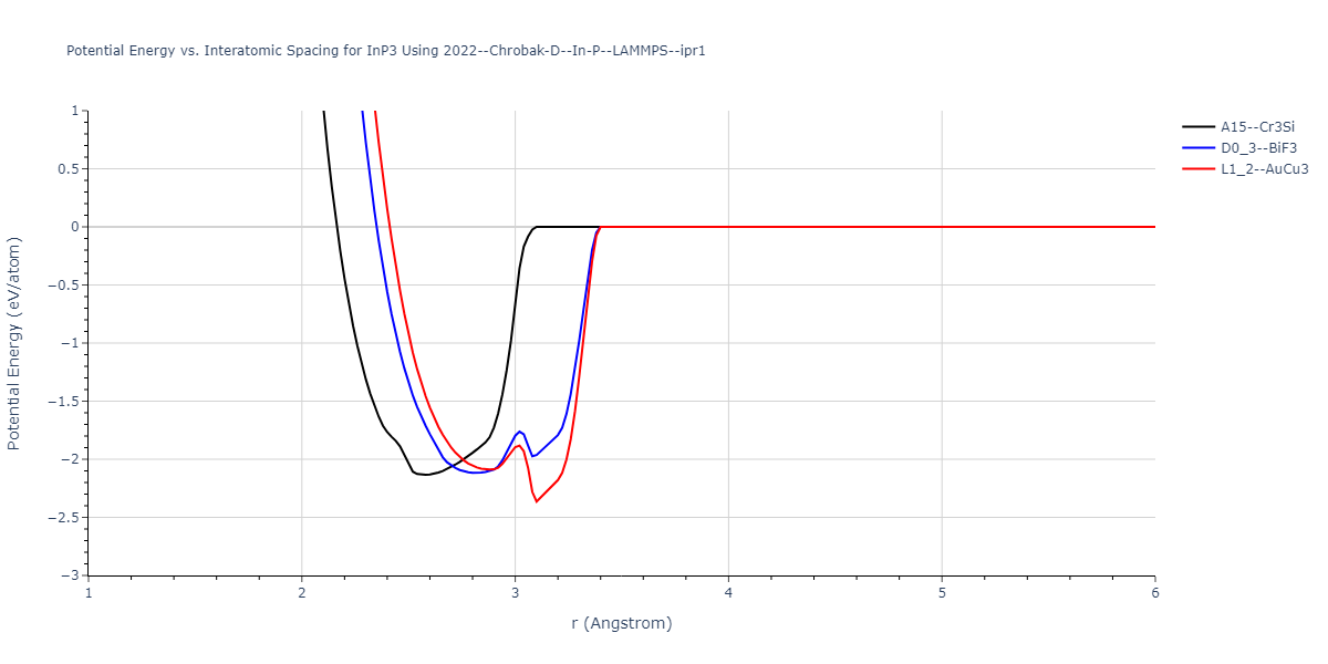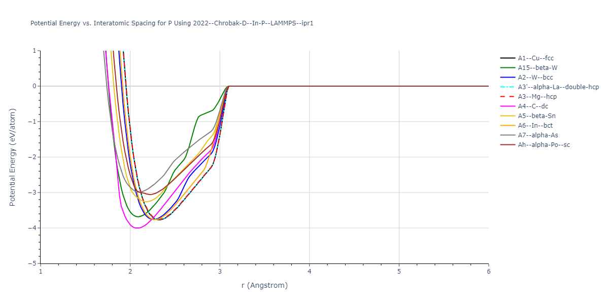 Plots of potential energy vs interatomic spacing, r, are shown below for a number of crystal structures. The structures are generated based on the ideal atomic positions and b/a and c/a lattice parameter ratios for a given crystal prototype. The size of the system is then uniformly scaled, and the energy calculated without relaxing the system. To obtain these plots, values of r are evaluated every 0.02 Å up to 6 Å.