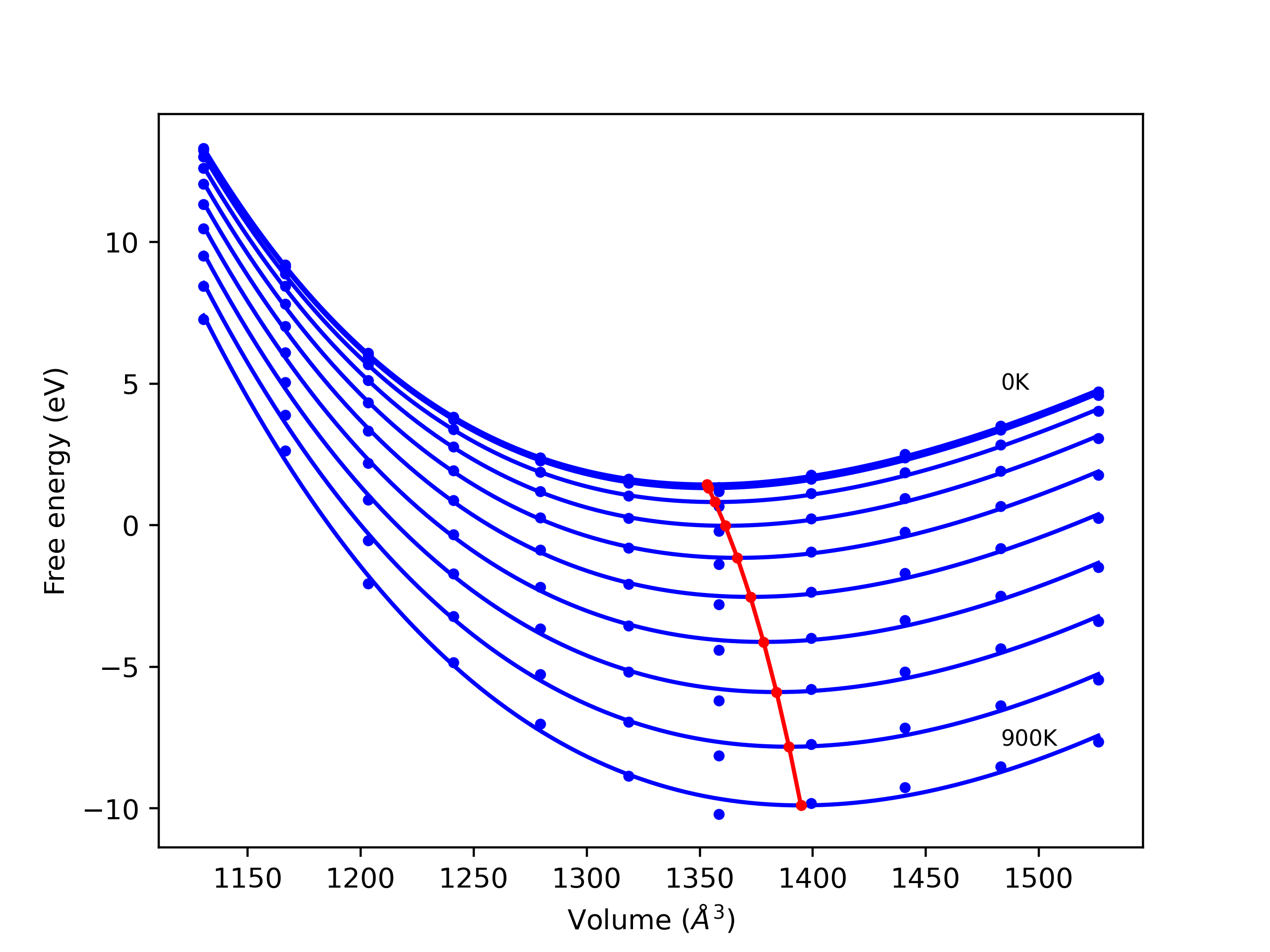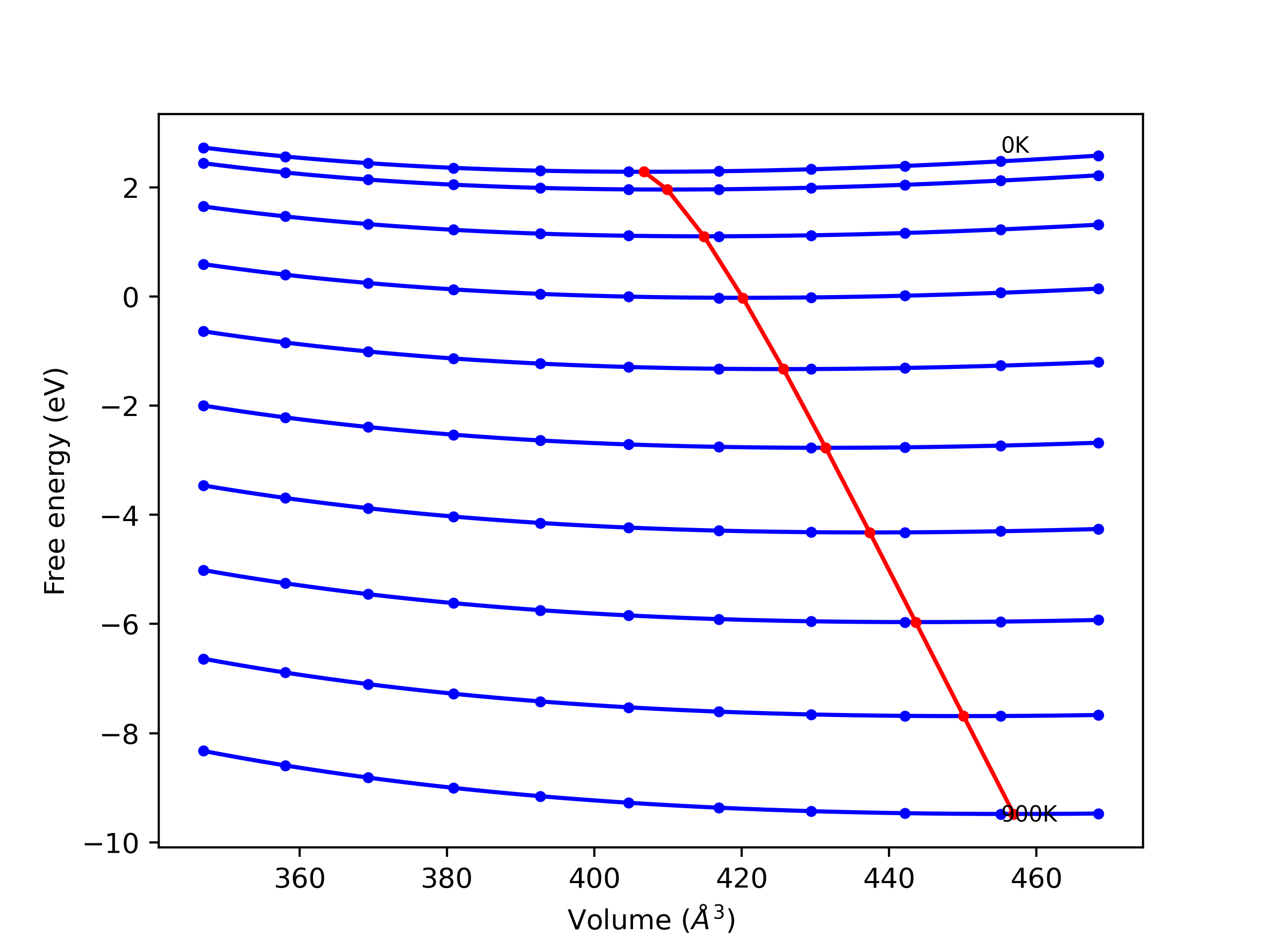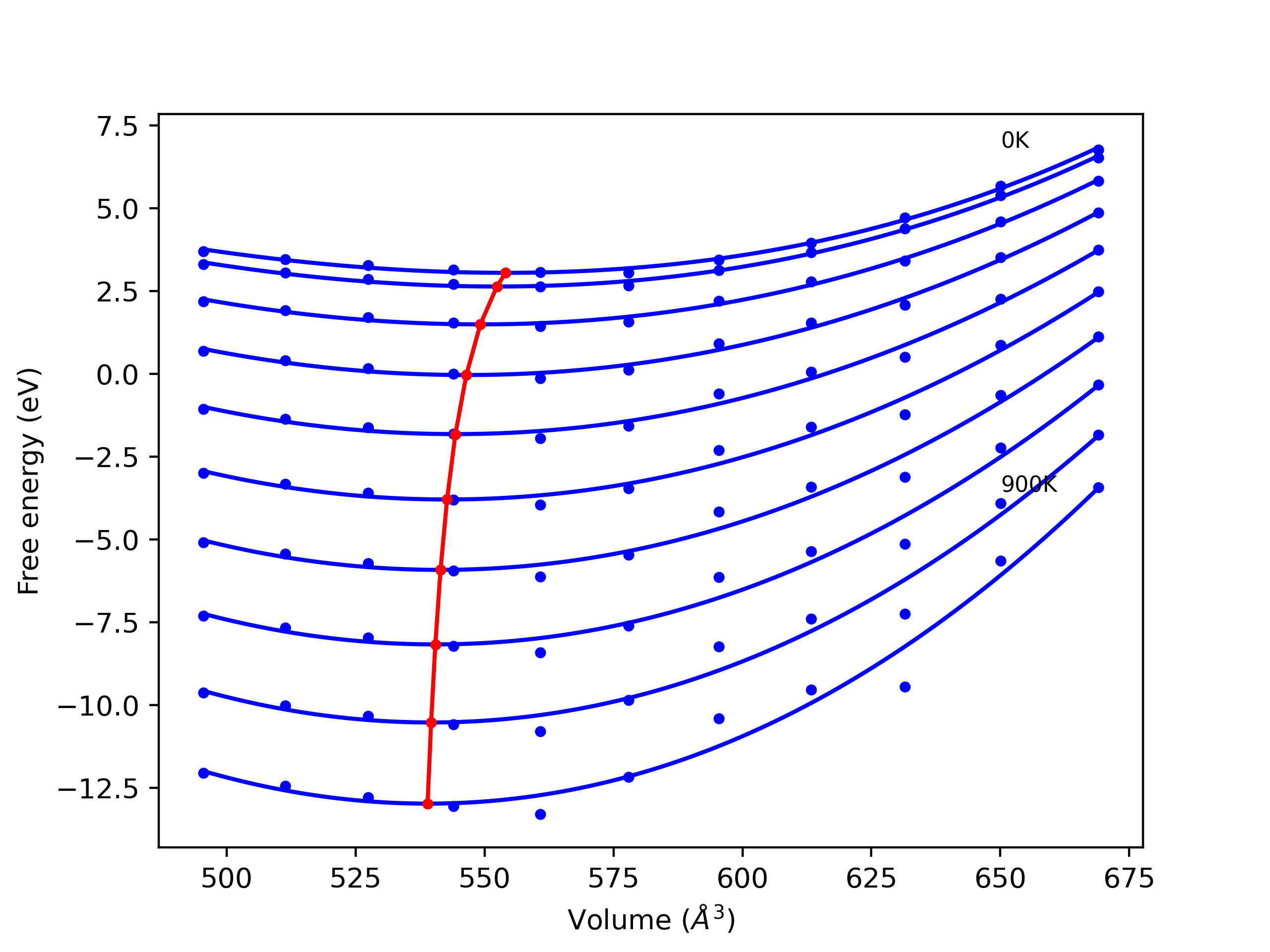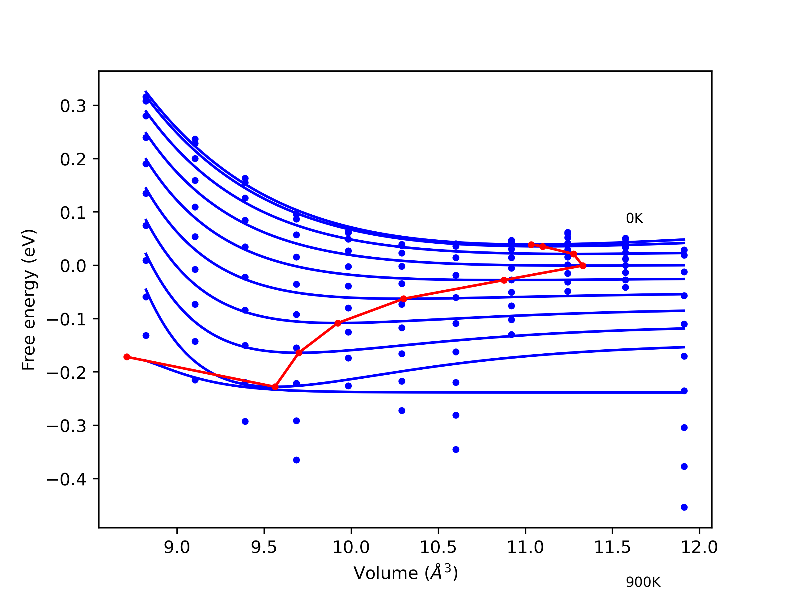 Phonon band structures and crystal properties estimated from quasi-harmonic approximation (QHA) calculations are displayed for select crystals. The calculations were performed using phonopy and LAMMPS. For the phonon calculations, 3x3 supercells of the potential-specific relaxed crystals were used. The QHA calculations were based on 11 strain states ranging from -0.05 to 0.05.