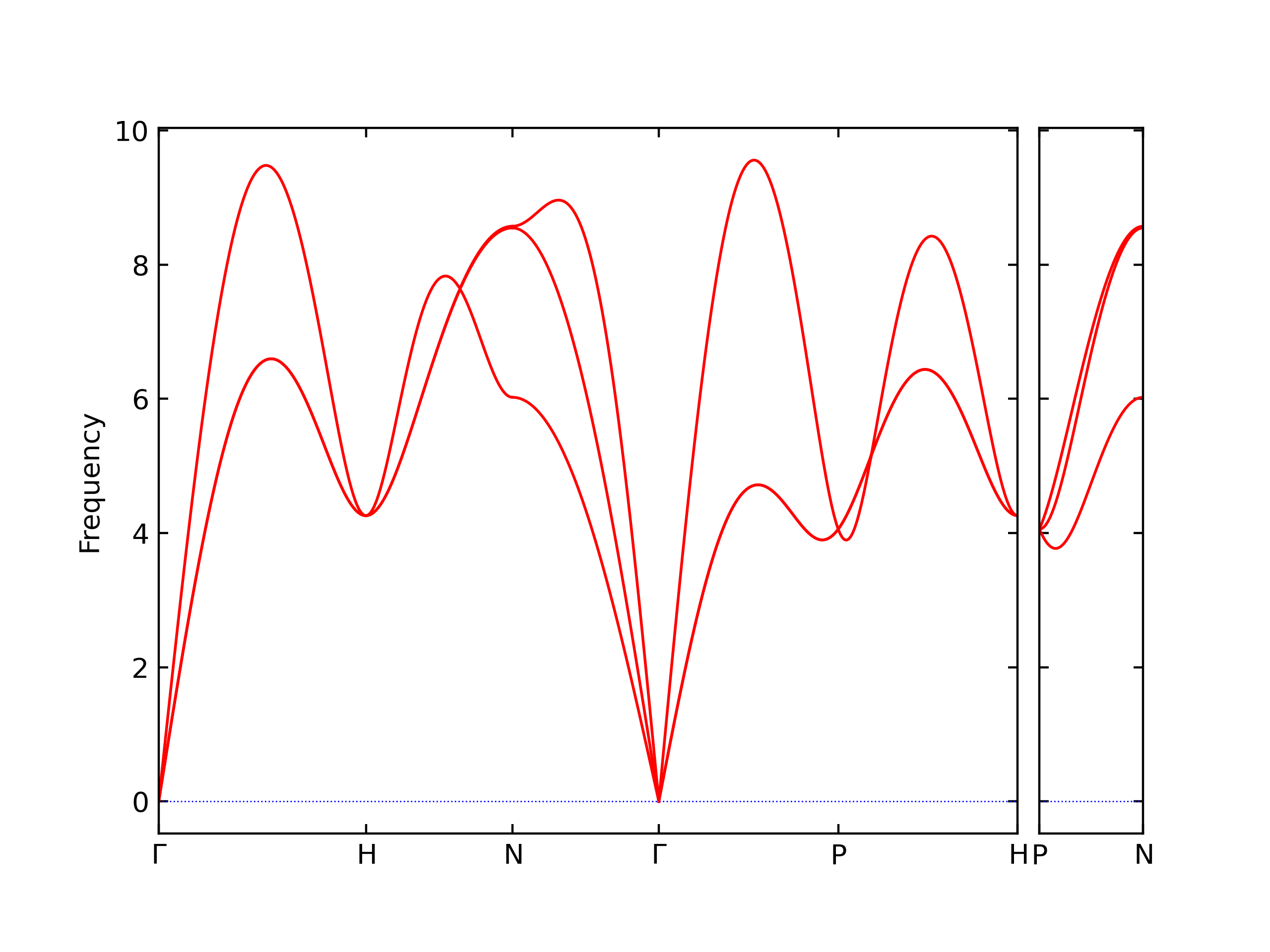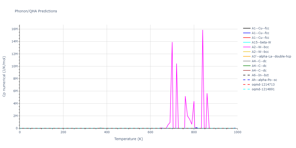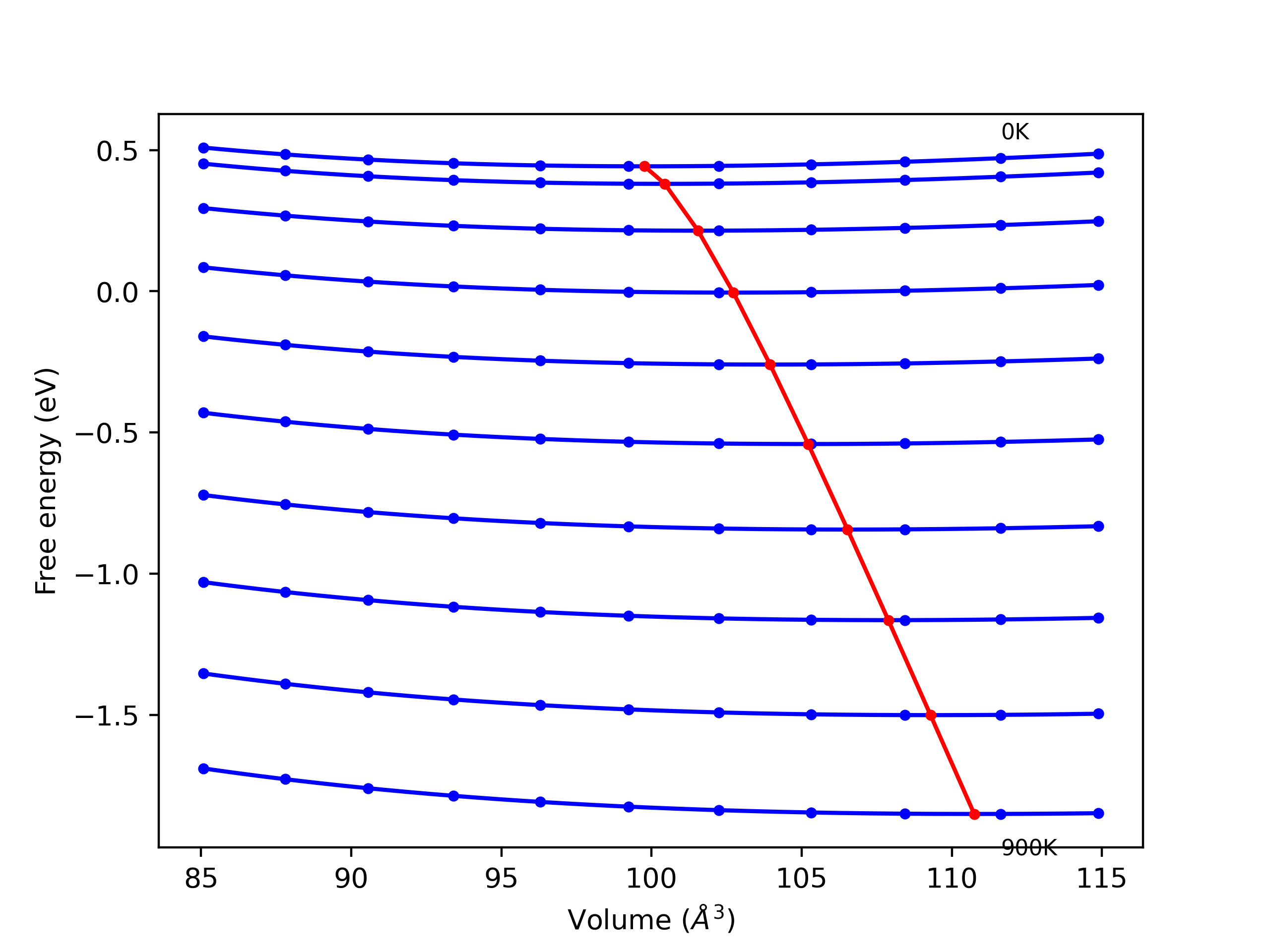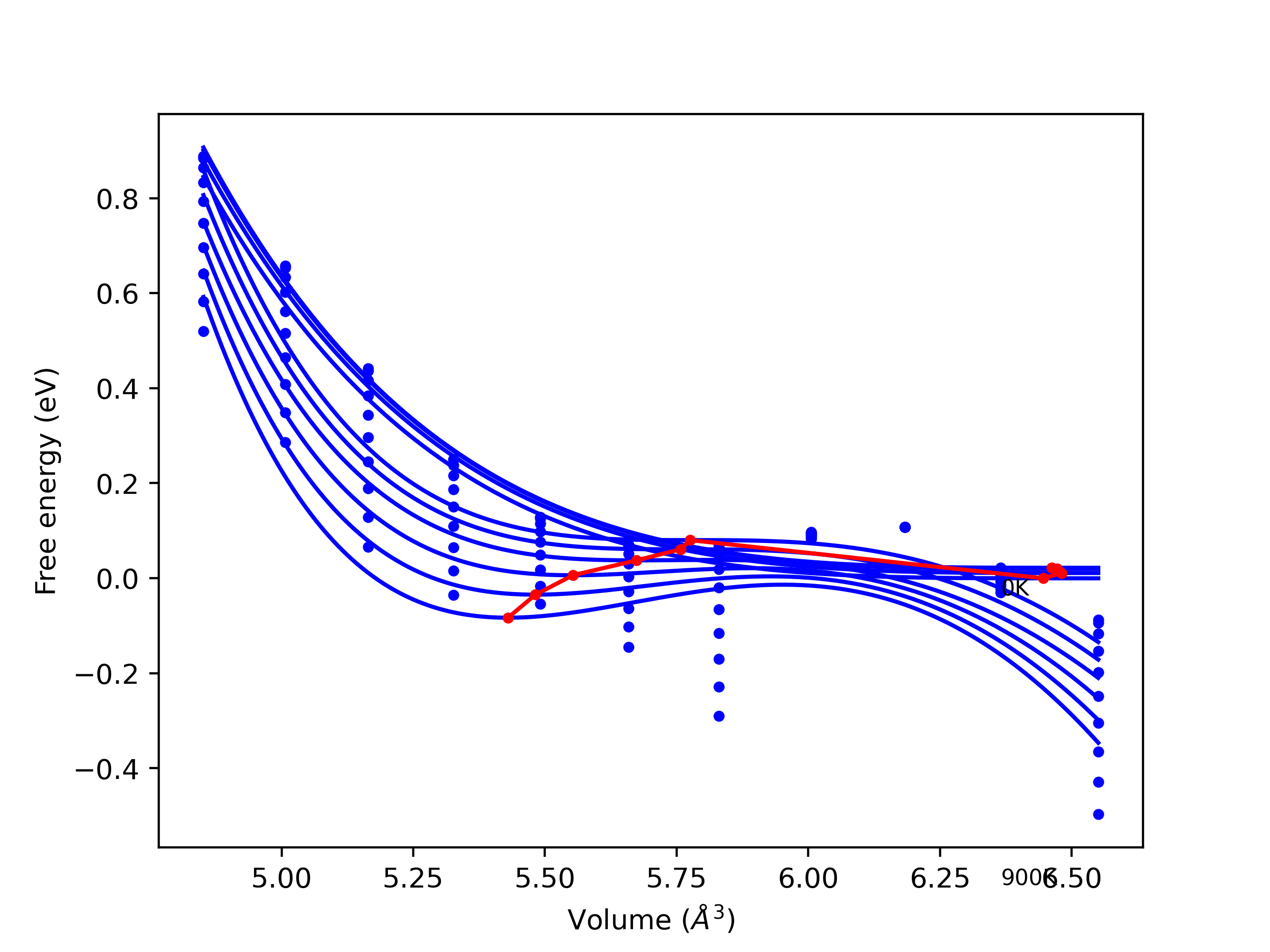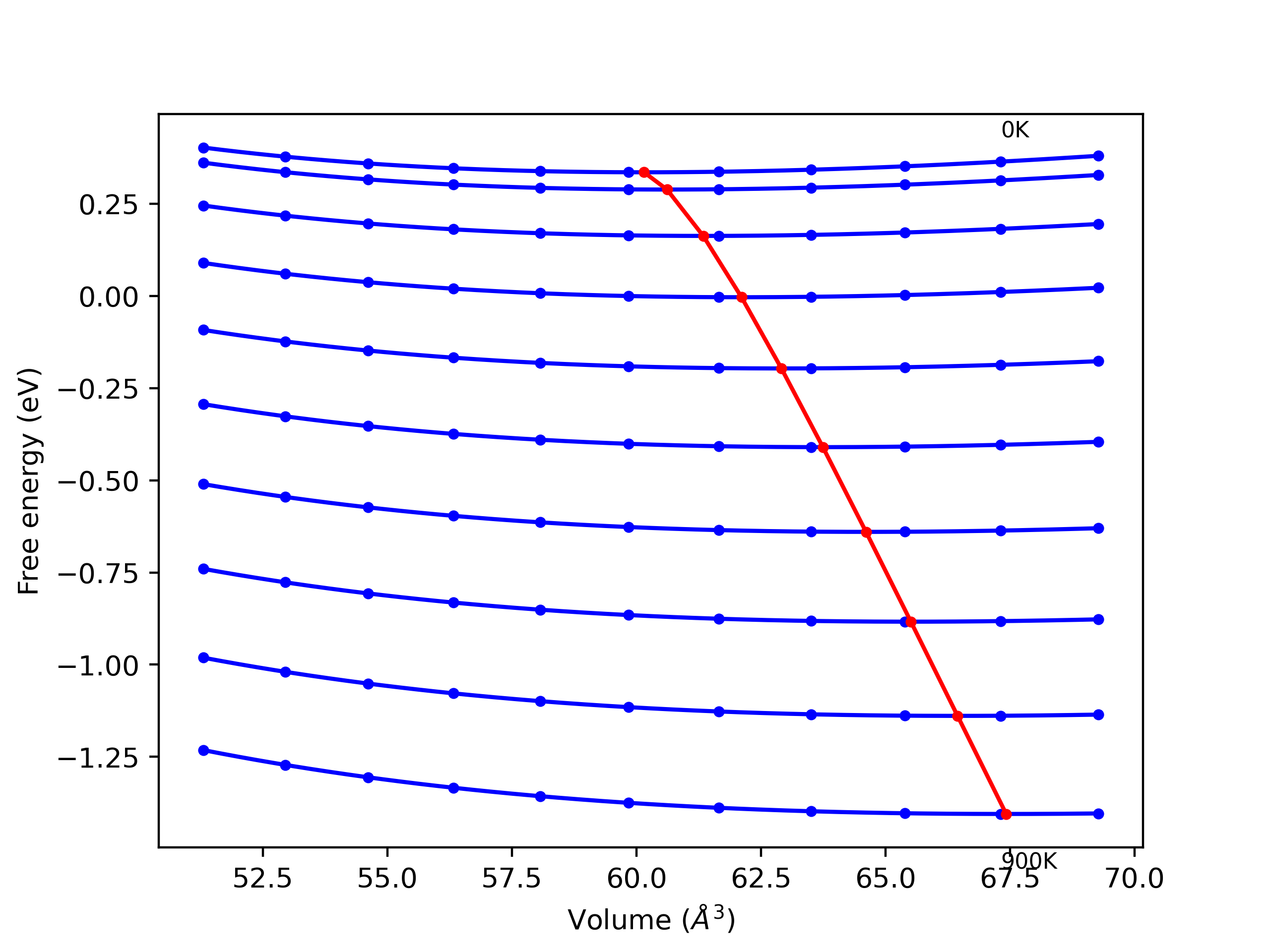 Phonon band structures and crystal properties estimated from quasi-harmonic approximation (QHA) calculations are displayed for select crystals. The calculations were performed using phonopy and LAMMPS. For the phonon calculations, 3x3 supercells of the potential-specific relaxed crystals were used. The QHA calculations were based on 11 strain states ranging from -0.05 to 0.05.