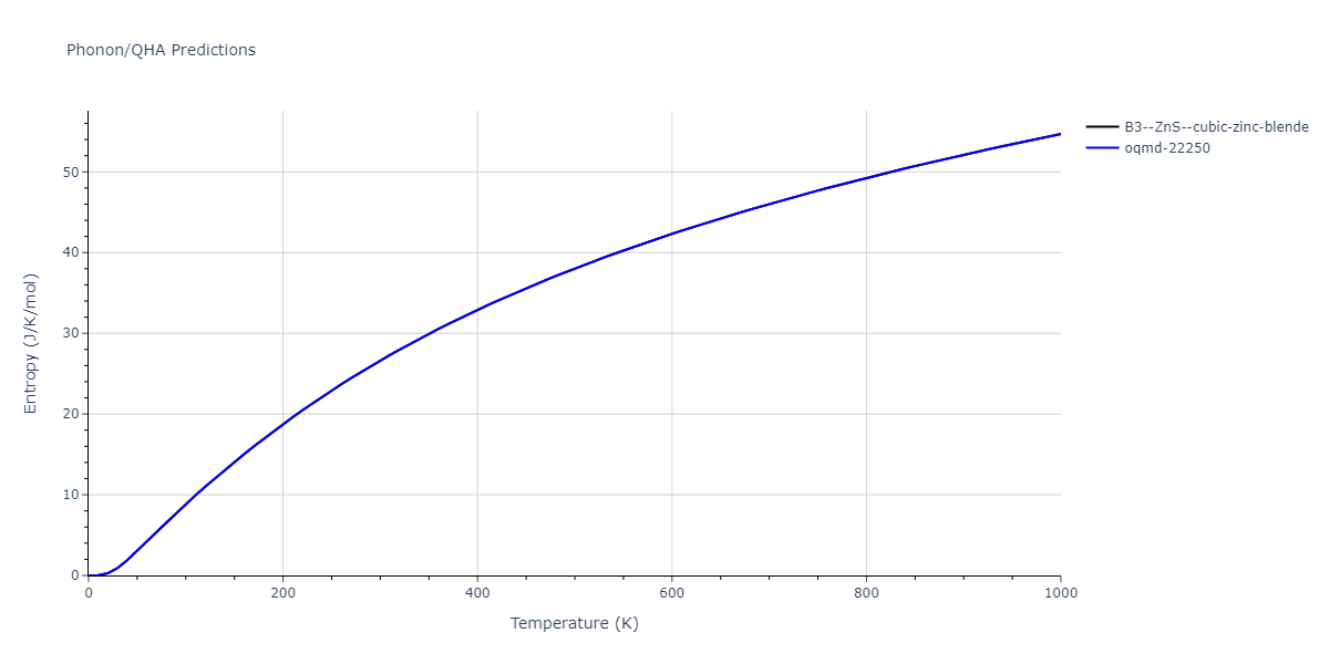 The Gibbs energies of the phases are estimated using thermodynamic integration between the interatomic potential in question and a simpler model with known Gibbs free energy values. For solids, the reference model is an Einstein solid, while for liquids it is the Uhlenbeck-Ford potential. Besides a short run at the start of the solid calculations to estimate Einstein model spring constants, the two calculations proceed similarly. Starting with the final relaxation configurations, the systems are stabilized for 25,000 steps. Then, over the next 50,000 steps the potential is swapped out for the reference potential. The system is then stabilized for another 25,000 steps with the reference model before a reverse swap of 50,000 steps is performed. The simulation ends with one final 25,000 step stabilization period. From the simulation, the irreversible work of transformation is estimated and used to compute the absolute Gibbs free energy of the target phase and potential relative to the reference potential. Entropy is estimated as the difference in enthalpy and Gibbs free energy and divided by temperature.