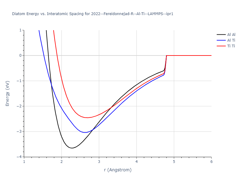 Plots of the potential energy vs interatomic spacing, r, are shown below for all diatom sets associated with the interatomic potential. This calculation provides insights into the functional form of the potential's two-body interactions. A system consisting of only two atoms is created, and the potential energy is evaluated for the atoms separated by 0.02 Å <= r <= 6.0> Å in intervals of 0.02 Å. Two plots are shown: one for the "standard" interaction distance range, and one for small values of r. The small r plot is useful for determining whether the potential is suitable for radiation studies.