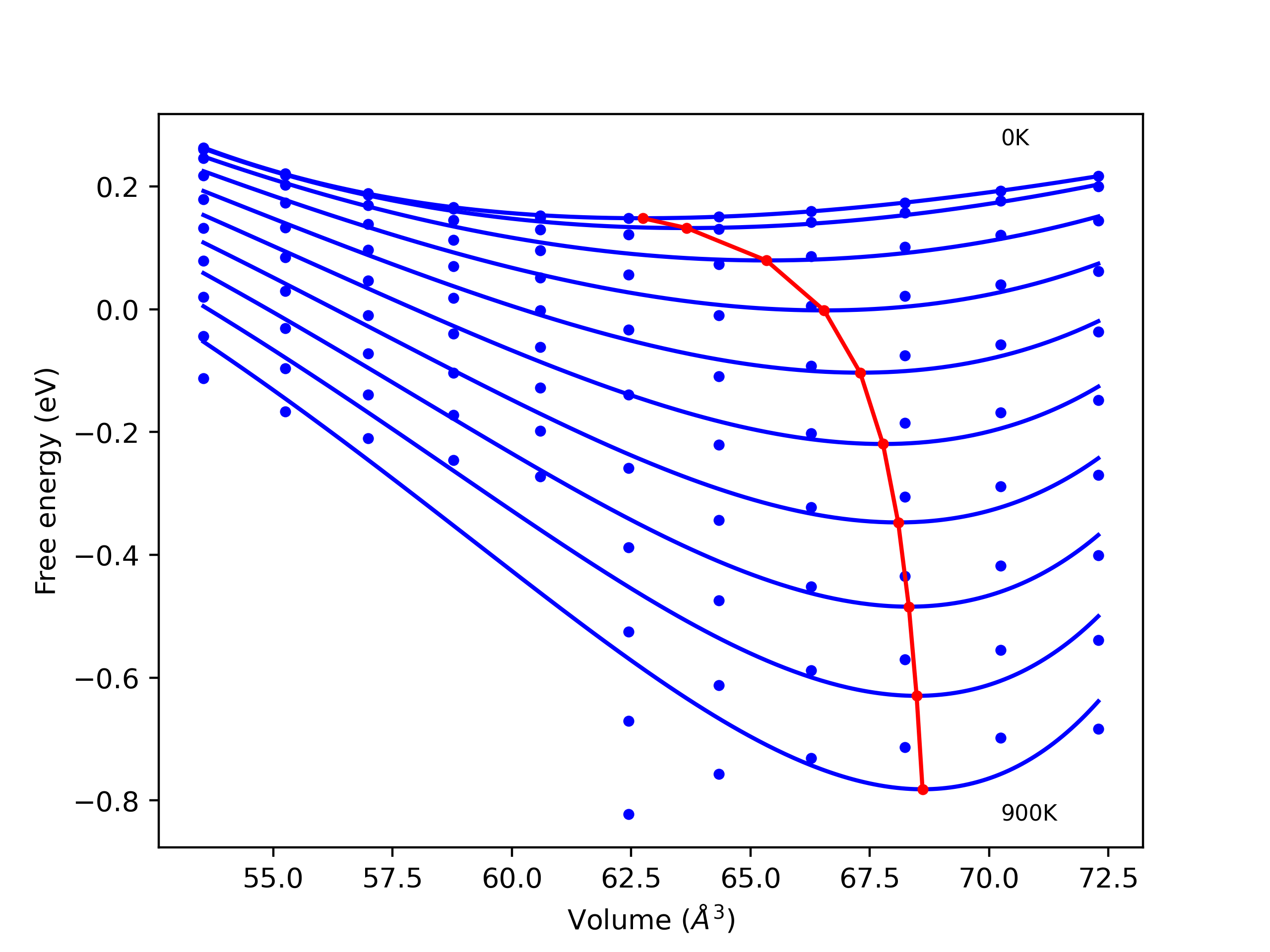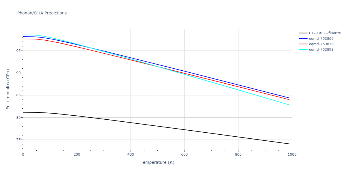 Plots of lattice and elastic constants are shown as a function of temperature. The 0K points were taken from the Crystal Structure Predictions and the Elastic Constants Predictions sections above for the unique crystal structures relaxed with the "dynamic" method. Starting from the 0 K relaxed crystal unit cells, supercell systems are created by replicating all three dimensions by the same multiplier to achieve at least 4000 atoms. The systems are then relaxed at 50 K and zero pressure using 1 million NPT steps. Lattice constants are estimated by averaging the measured box dimensions. Temperatures are iteratively increased by 50 K, with each subsequent relaxation calculation starting from the final atomic configuration at the previous temperature and relaxing for another 1 million steps.