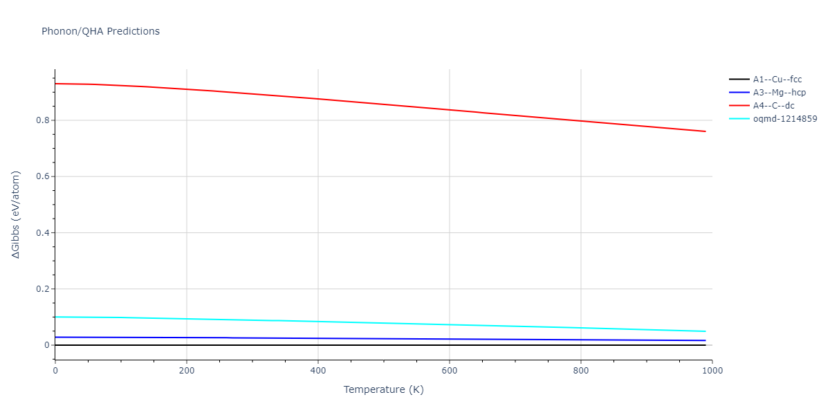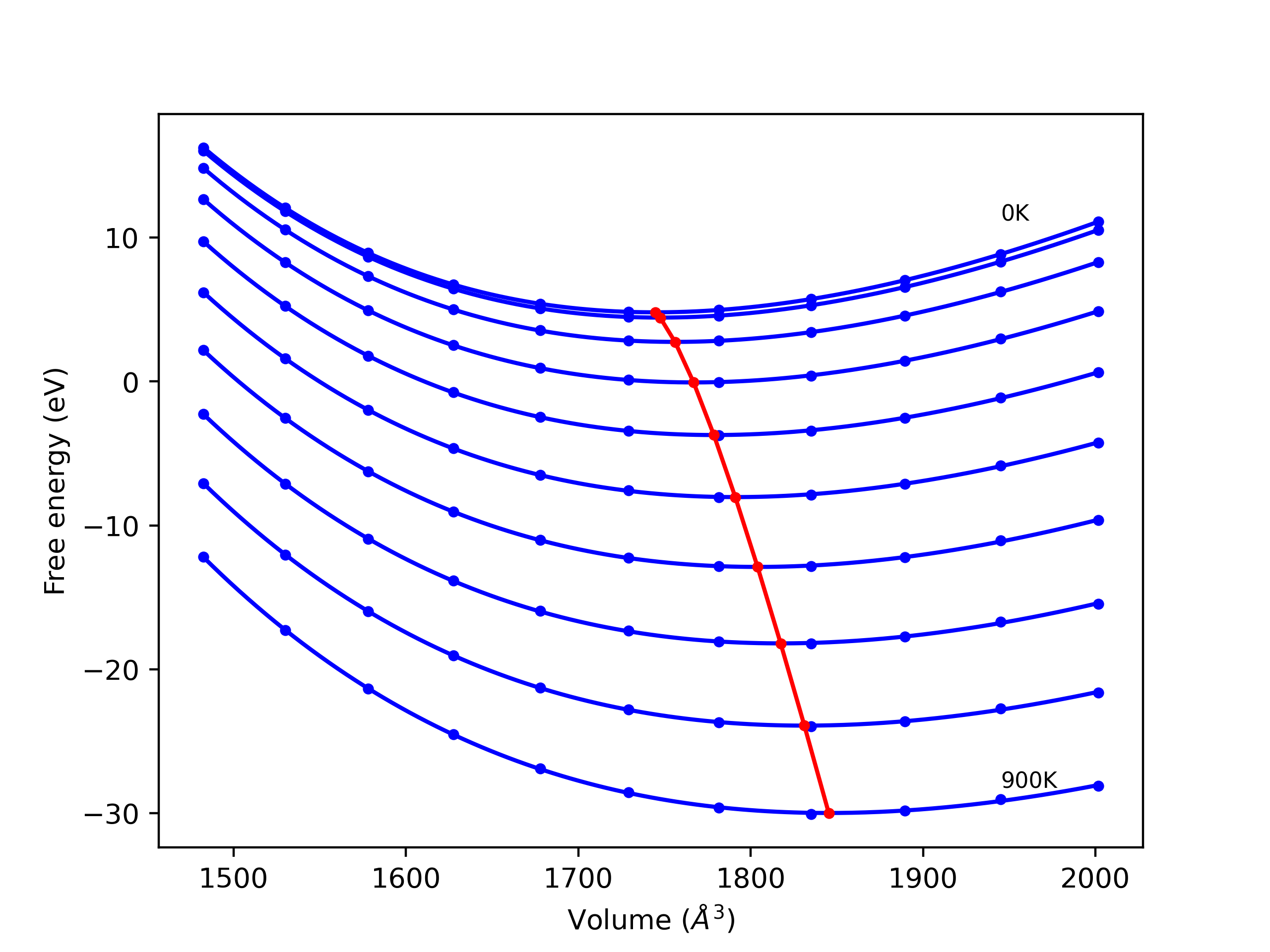 The Gibbs energies of the phases are estimated using thermodynamic integration between the interatomic potential in question and a simpler model with known Gibbs free energy values. For solids, the reference model is an Einstein solid, while for liquids it is the Uhlenbeck-Ford potential. Besides a short run at the start of the solid calculations to estimate Einstein model spring constants, the two calculations proceed similarly. Starting with the final relaxation configurations, the systems are stabilized for 25,000 steps. Then, over the next 50,000 steps the potential is swapped out for the reference potential. The system is then stabilized for another 25,000 steps with the reference model before a reverse swap of 50,000 steps is performed. The simulation ends with one final 25,000 step stabilization period. From the simulation, the irreversible work of transformation is estimated and used to compute the absolute Gibbs free energy of the target phase and potential relative to the reference potential. Entropy is estimated as the difference in enthalpy and Gibbs free energy and divided by temperature.