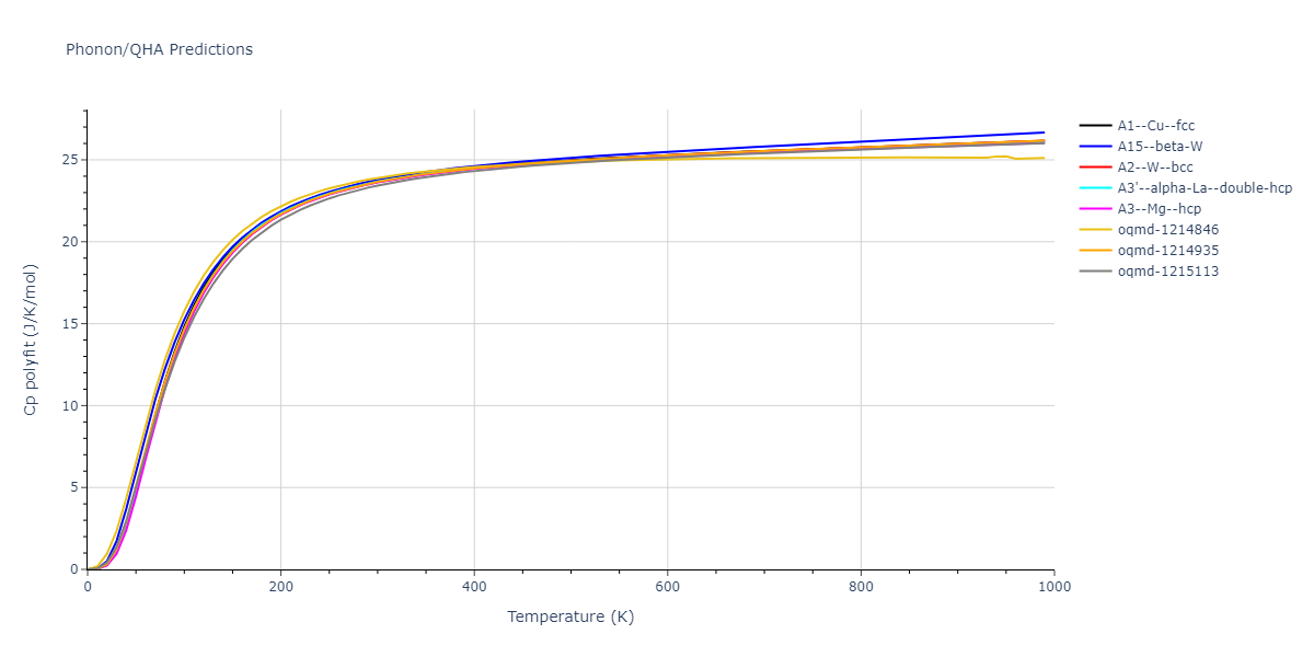 Plots of internal energy, Gibbs free energy, entropy, heat capacity and volume are shown here as a function of temperature for various crystal structures and liquid phases. The included crystal structures correspond to those in the Solid Structures vs. Temperature section, and the liquid phases to those in the Liquid Properties section. Internal energy and volume are taken from the associated structure relaxations mentioned in those previous sections. Constant pressure heat capacity is estimated using 3-point numerical derivatives of enthalpy versus temperature. Note that since all simulations done here are at 0 pressure, internal energy and enthalpy are equivalent.
