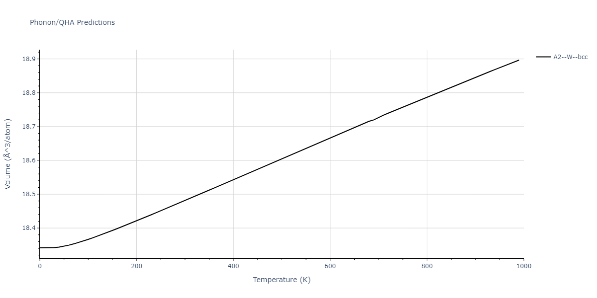 Phonon band structures and crystal properties estimated from quasi-harmonic approximation (QHA) calculations are displayed for select crystals. The calculations were performed using phonopy and LAMMPS. For the phonon calculations, 3x3 supercells of the potential-specific relaxed crystals were used. The QHA calculations were based on 11 strain states ranging from -0.05 to 0.05.