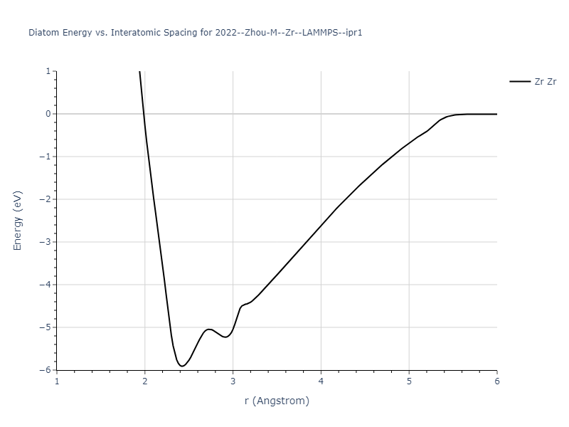 Plots of the potential energy vs interatomic spacing, r, are shown below for all diatom sets associated with the interatomic potential. This calculation provides insights into the functional form of the potential's two-body interactions. A system consisting of only two atoms is created, and the potential energy is evaluated for the atoms separated by 0.02 Å <= r <= 6.0> Å in intervals of 0.02 Å. Two plots are shown: one for the "standard" interaction distance range, and one for small values of r. The small r plot is useful for determining whether the potential is suitable for radiation studies.