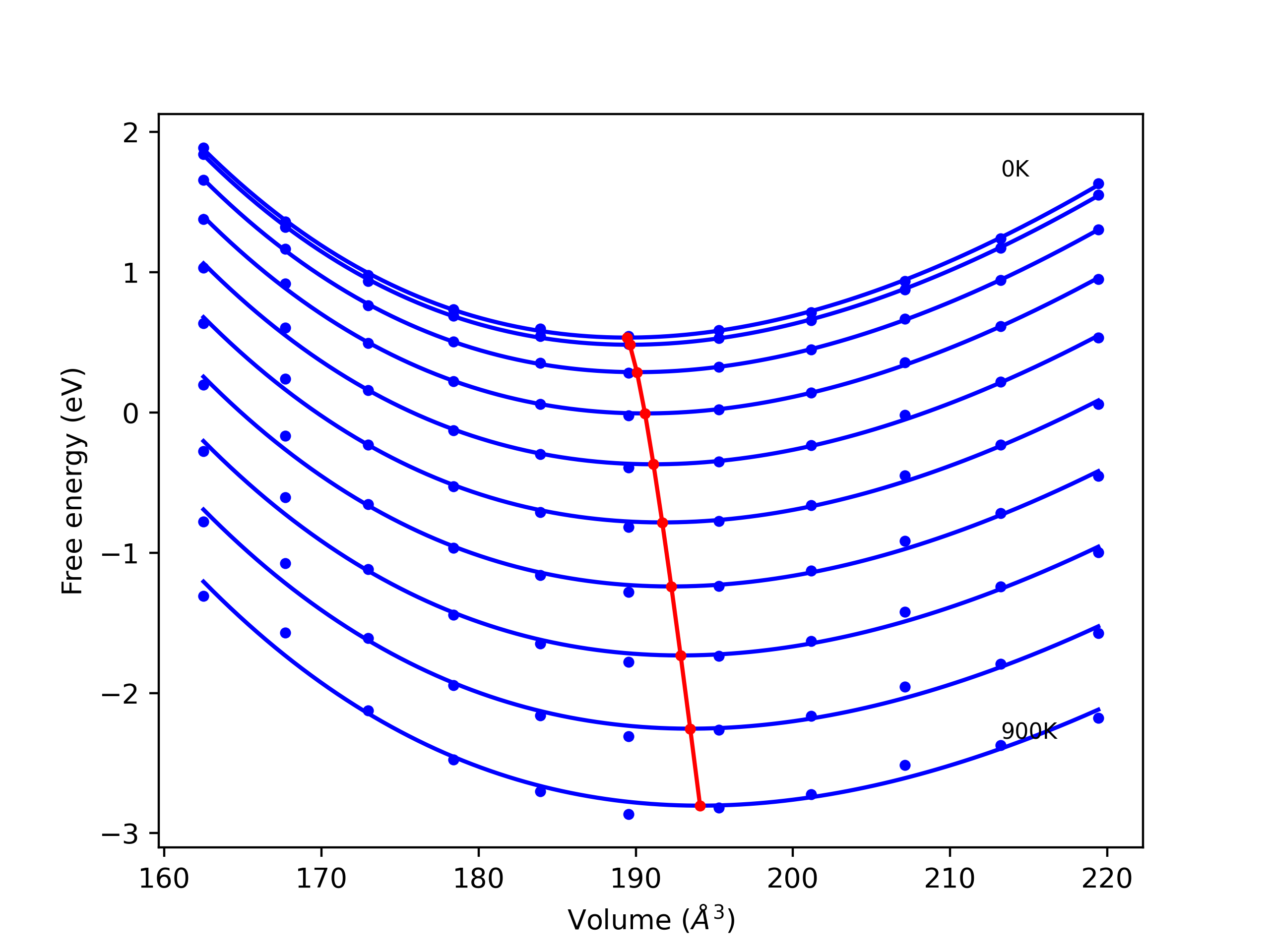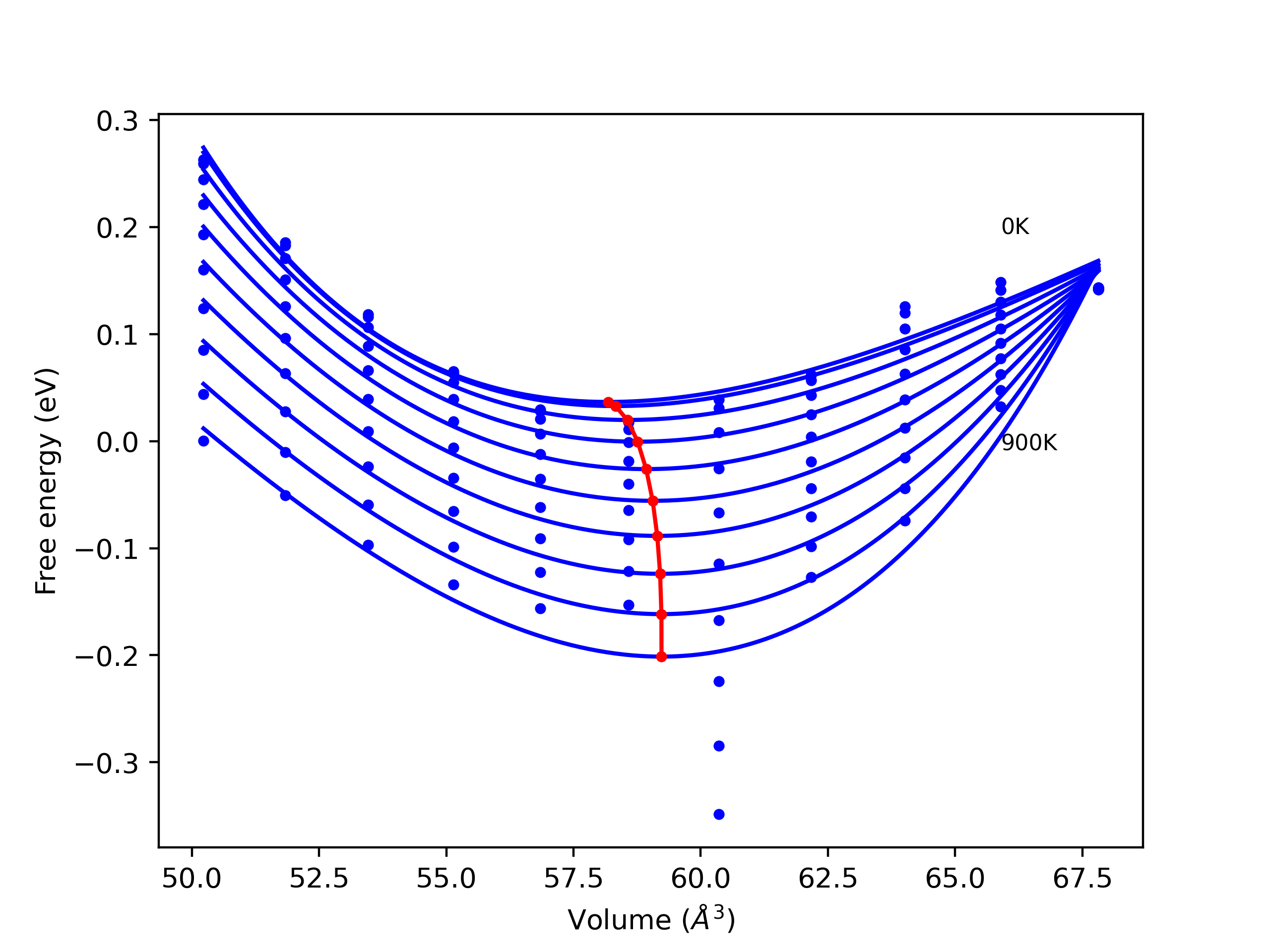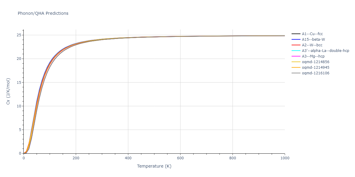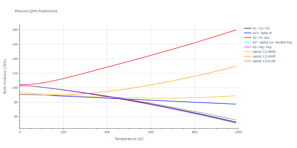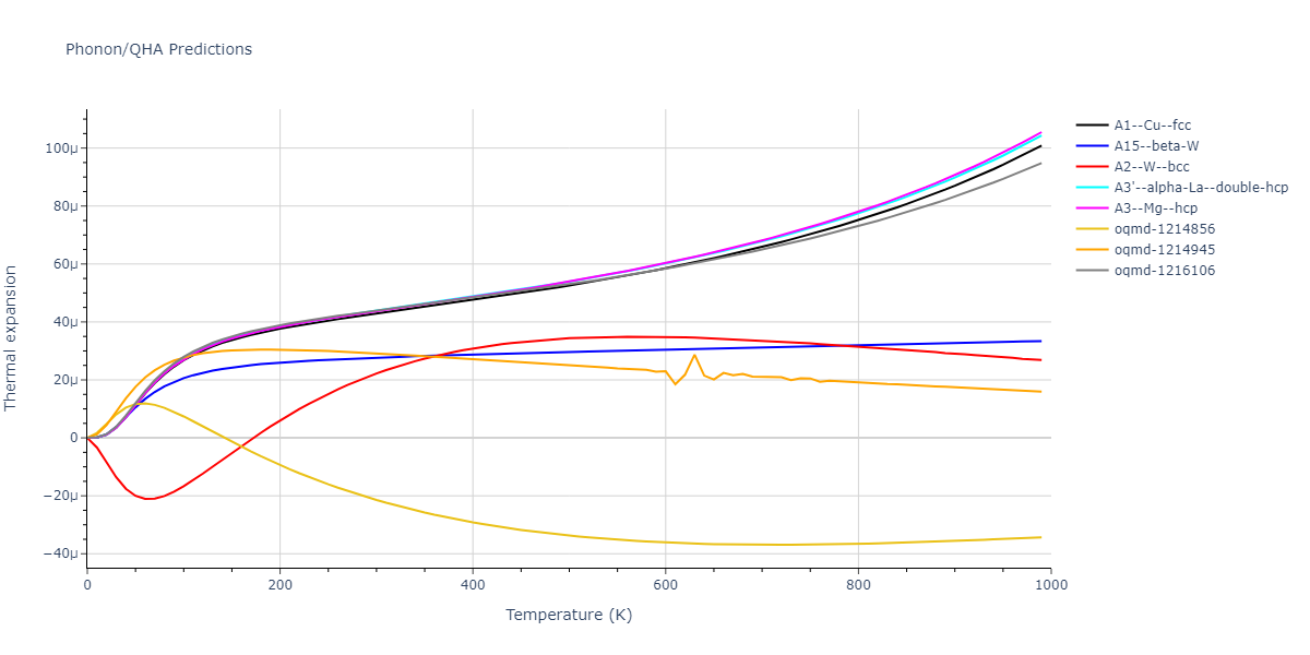 Phonon band structures and crystal properties estimated from quasi-harmonic approximation (QHA) calculations are displayed for select crystals. The calculations were performed using phonopy and LAMMPS. For the phonon calculations, 3x3 supercells of the potential-specific relaxed crystals were used. The QHA calculations were based on 11 strain states ranging from -0.05 to 0.05.
