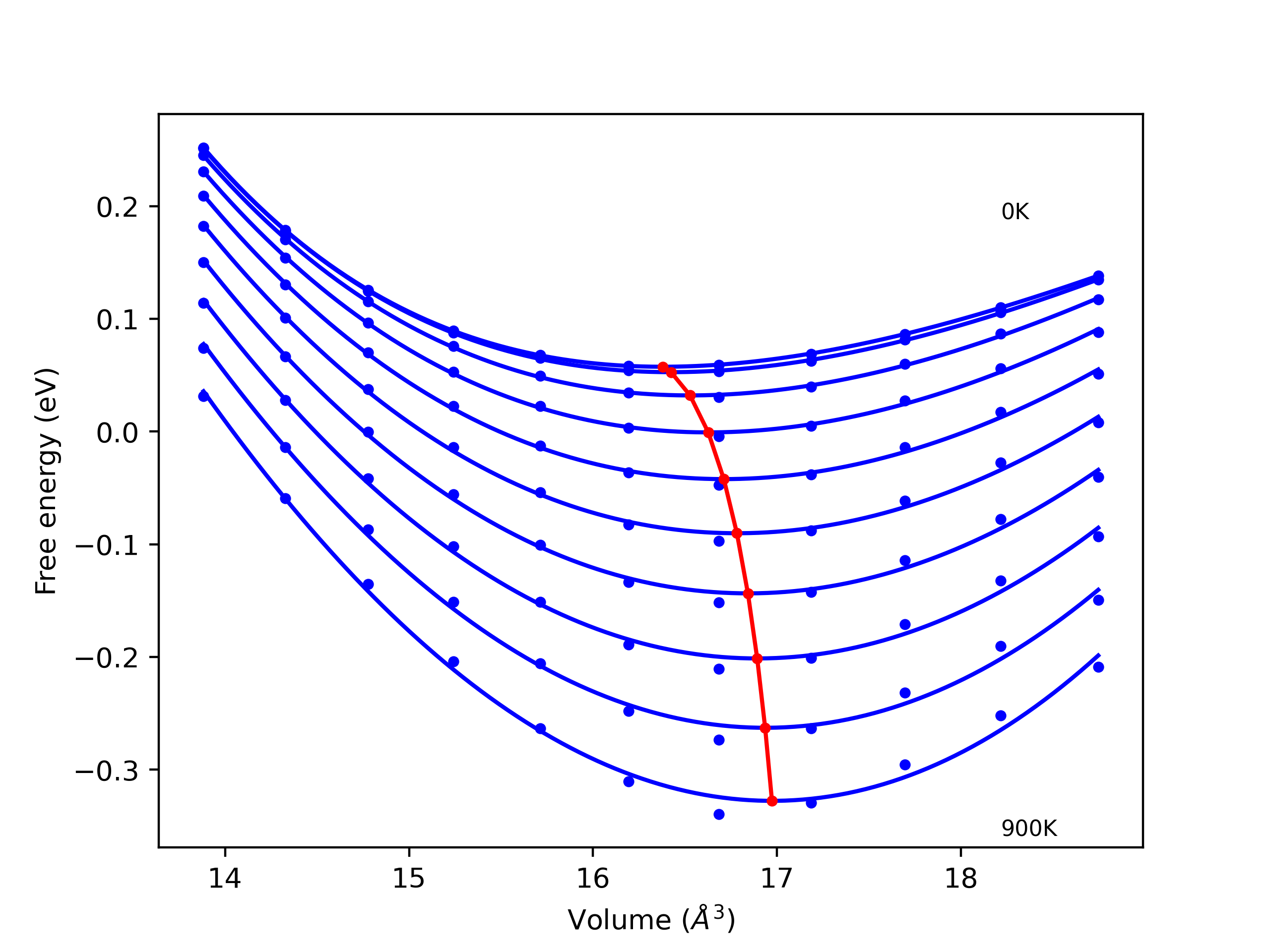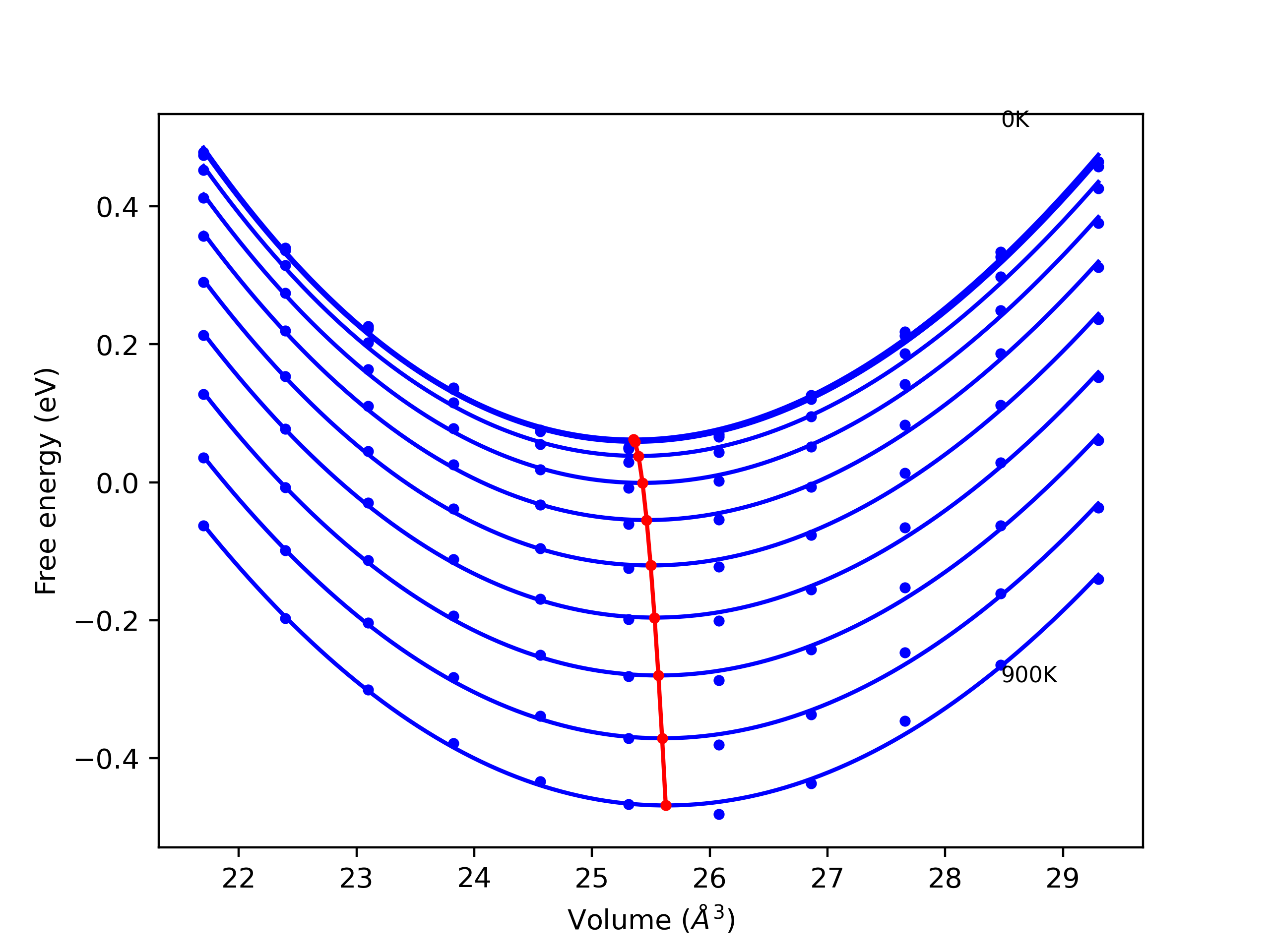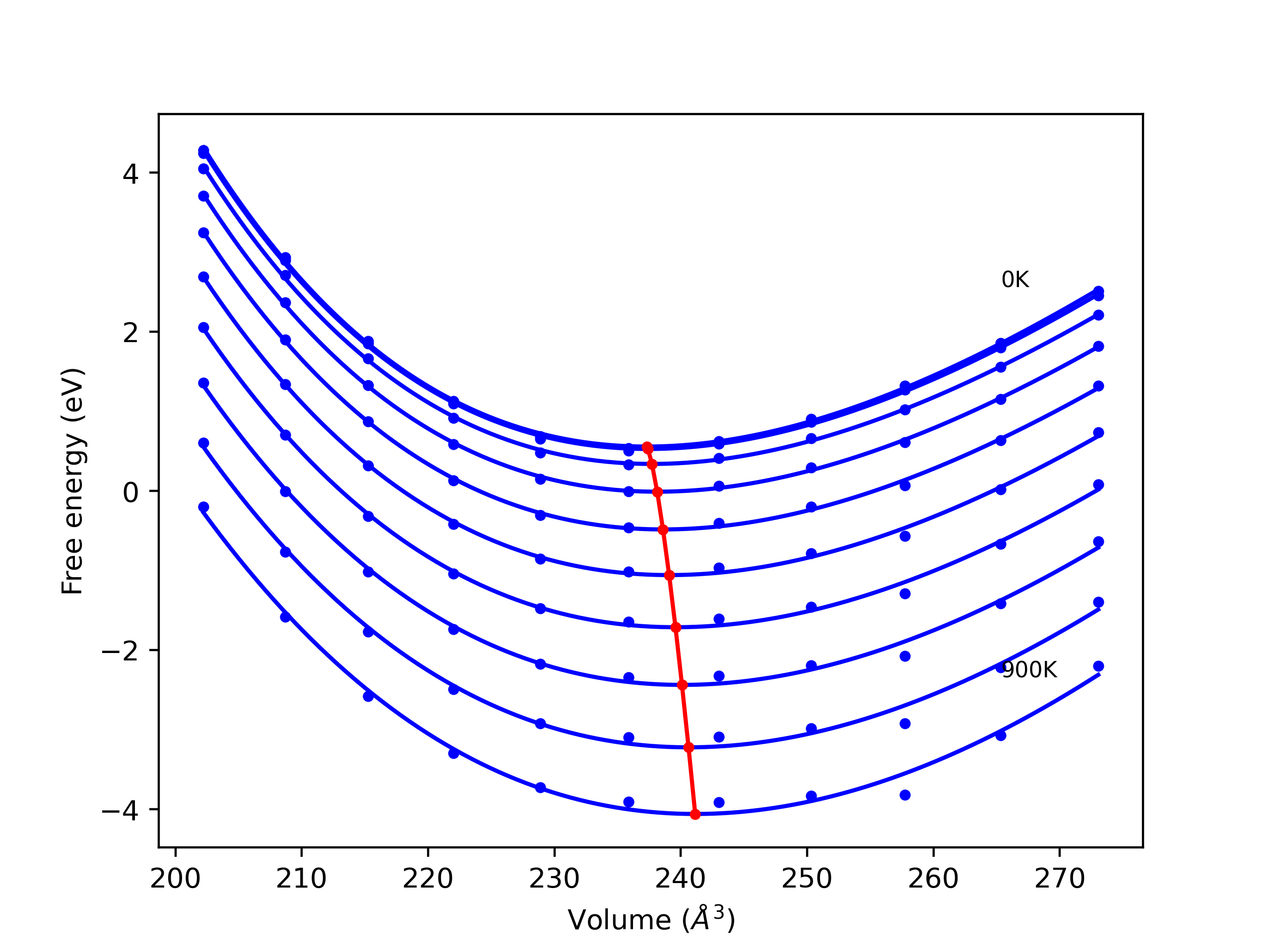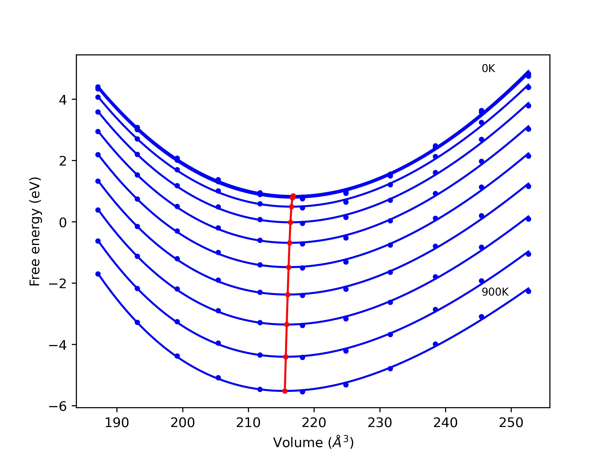 Plots of lattice and elastic constants are shown as a function of temperature. The 0K points were taken from the Crystal Structure Predictions and the Elastic Constants Predictions sections above for the unique crystal structures relaxed with the "dynamic" method. Starting from the 0 K relaxed crystal unit cells, supercell systems are created by replicating all three dimensions by the same multiplier to achieve at least 4000 atoms. The systems are then relaxed at 50 K and zero pressure using 1 million NPT steps. Lattice constants are estimated by averaging the measured box dimensions. Temperatures are iteratively increased by 50 K, with each subsequent relaxation calculation starting from the final atomic configuration at the previous temperature and relaxing for another 1 million steps.