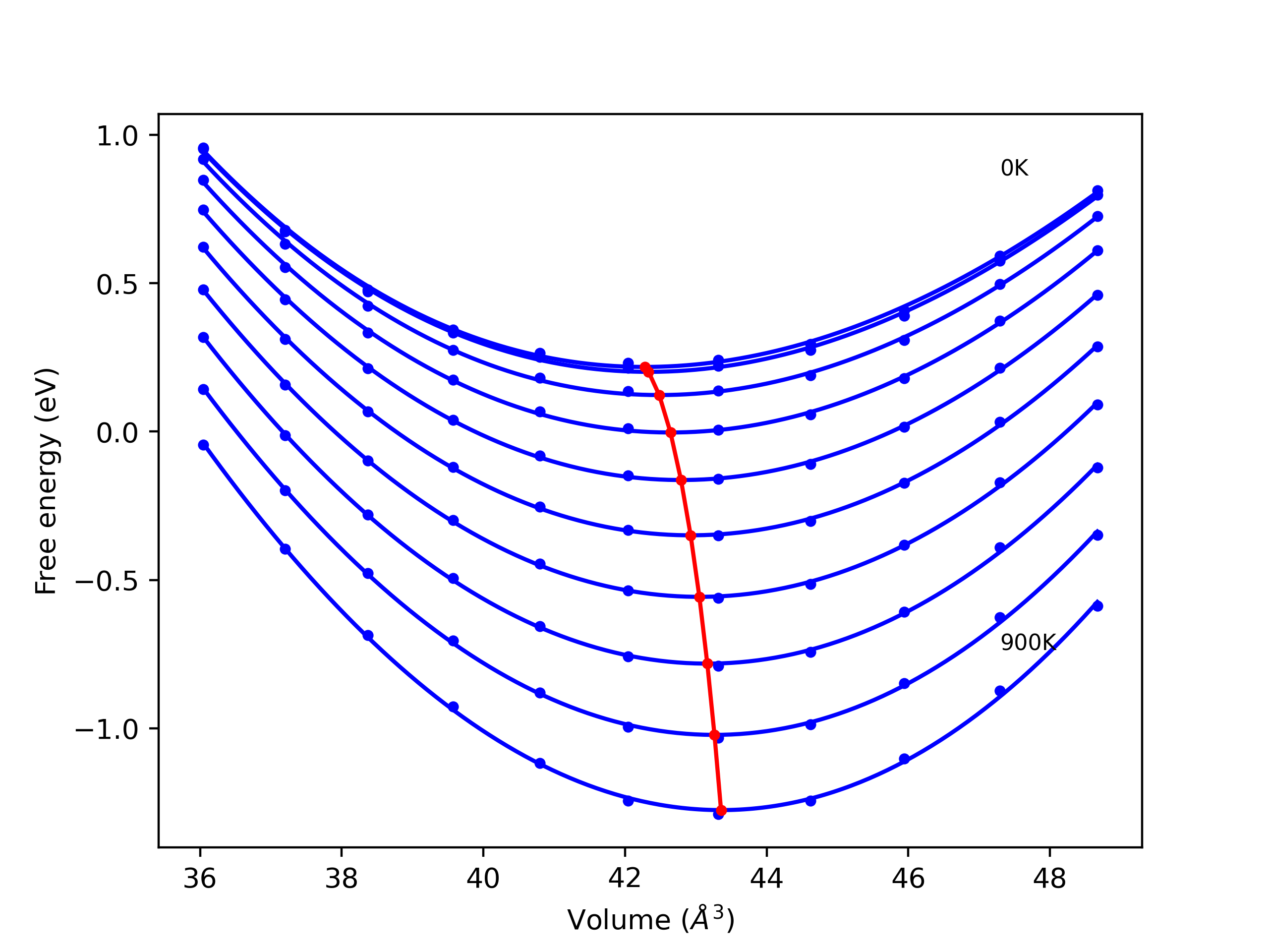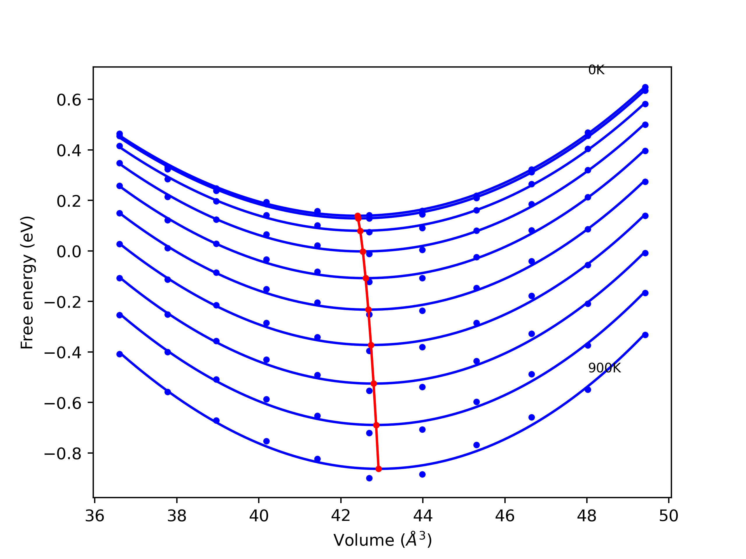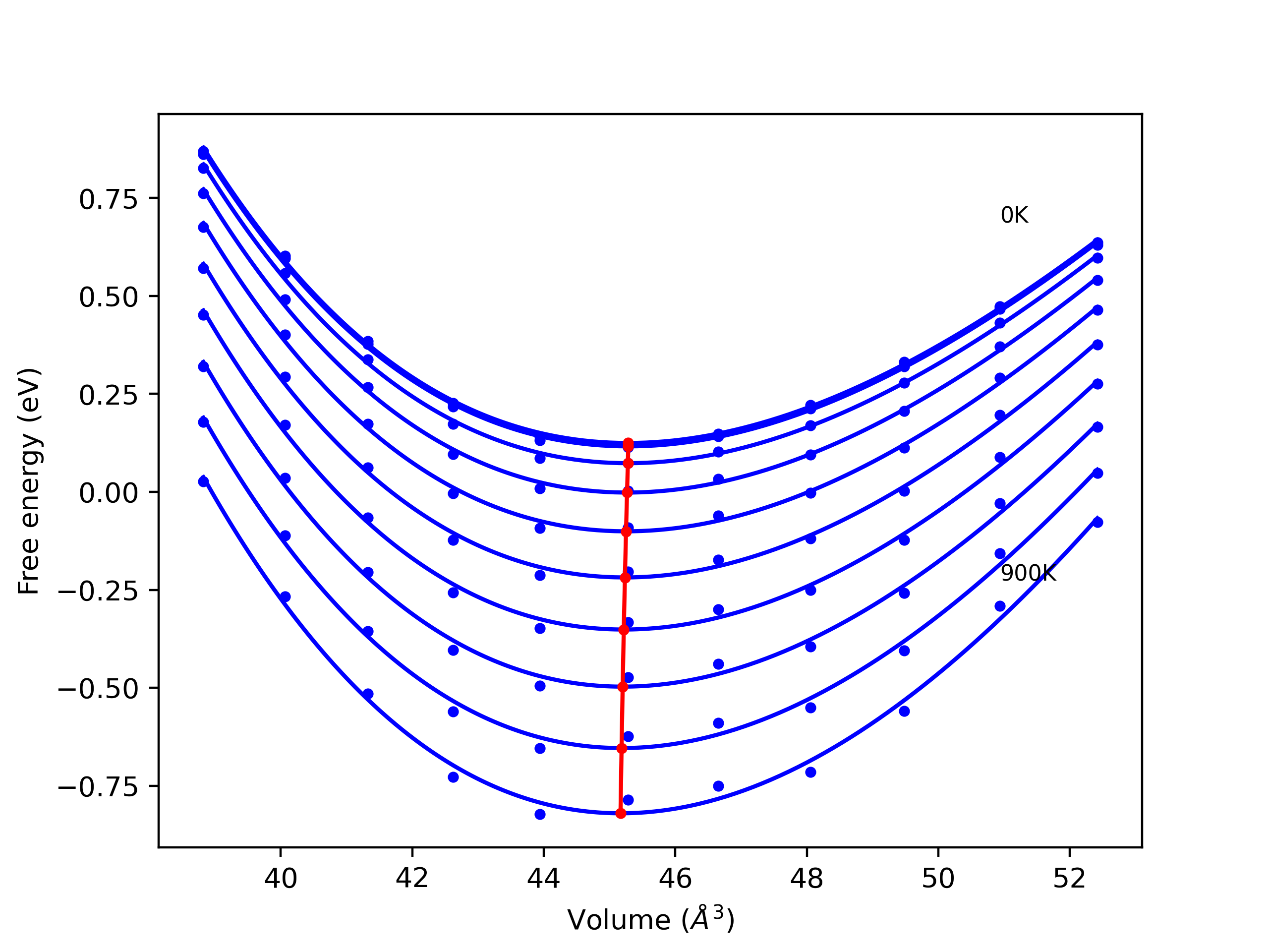 The Gibbs energies of the phases are estimated using thermodynamic integration between the interatomic potential in question and a simpler model with known Gibbs free energy values. For solids, the reference model is an Einstein solid, while for liquids it is the Uhlenbeck-Ford potential. Besides a short run at the start of the solid calculations to estimate Einstein model spring constants, the two calculations proceed similarly. Starting with the final relaxation configurations, the systems are stabilized for 25,000 steps. Then, over the next 50,000 steps the potential is swapped out for the reference potential. The system is then stabilized for another 25,000 steps with the reference model before a reverse swap of 50,000 steps is performed. The simulation ends with one final 25,000 step stabilization period. From the simulation, the irreversible work of transformation is estimated and used to compute the absolute Gibbs free energy of the target phase and potential relative to the reference potential. Entropy is estimated as the difference in enthalpy and Gibbs free energy and divided by temperature.