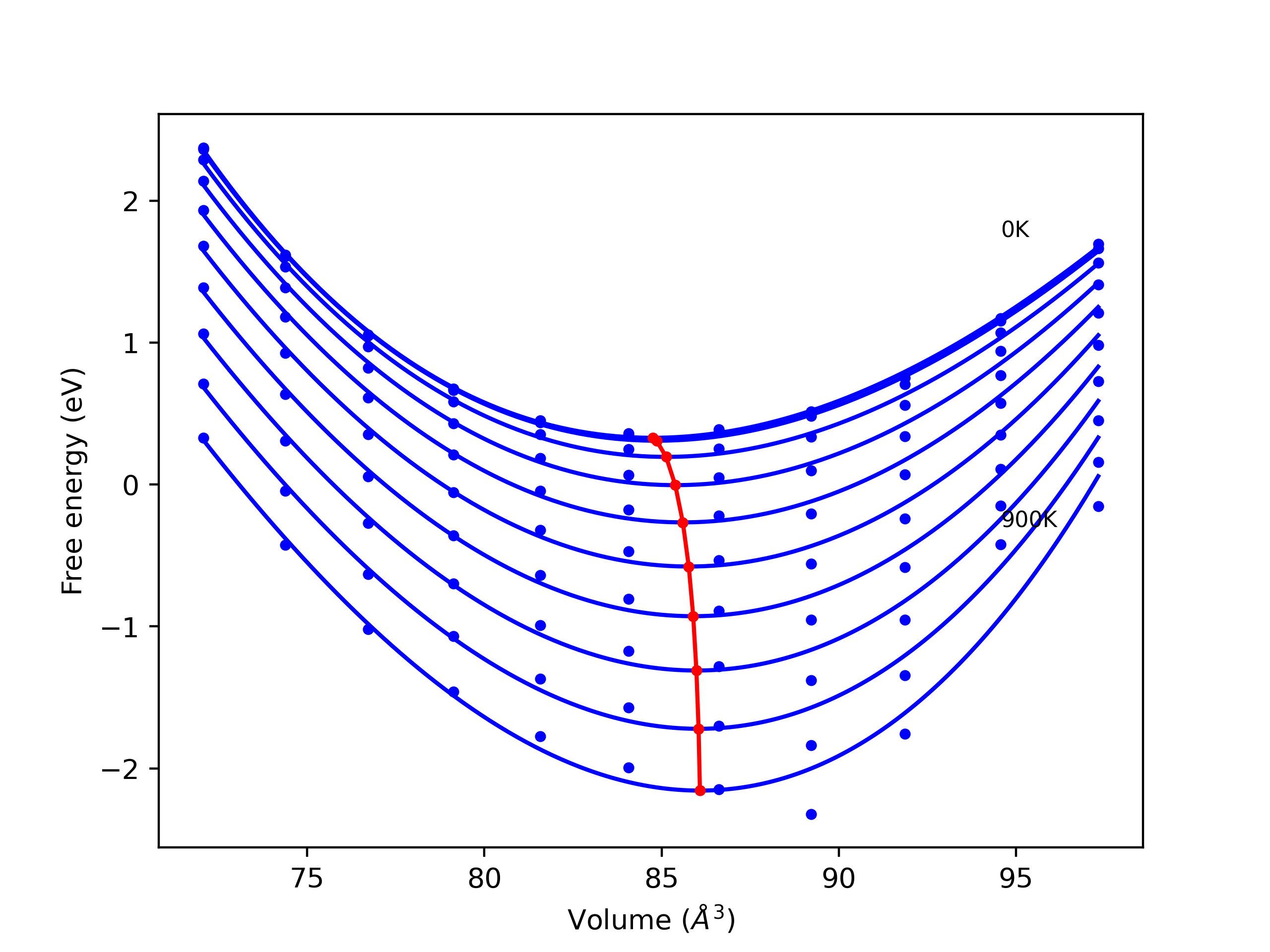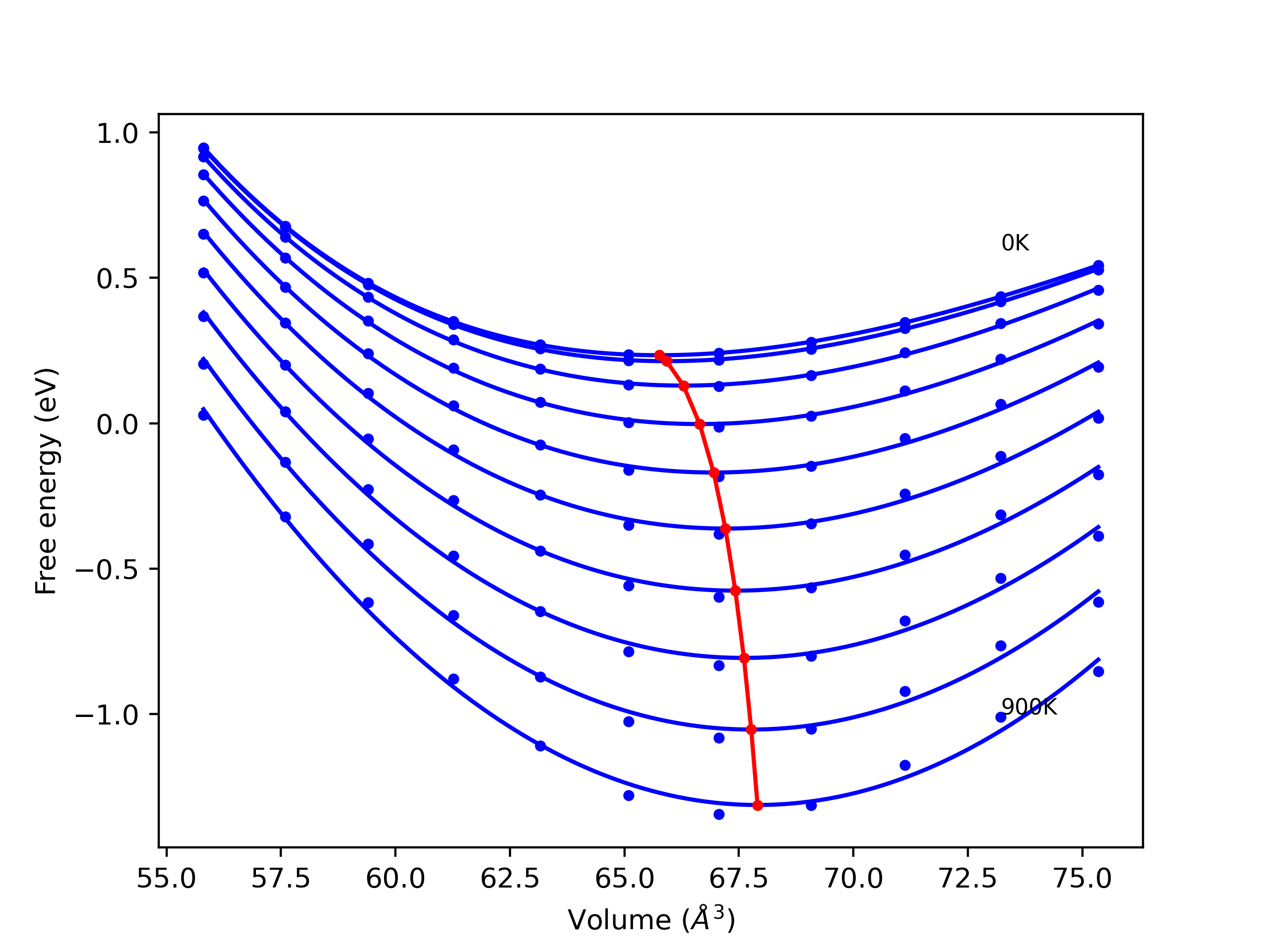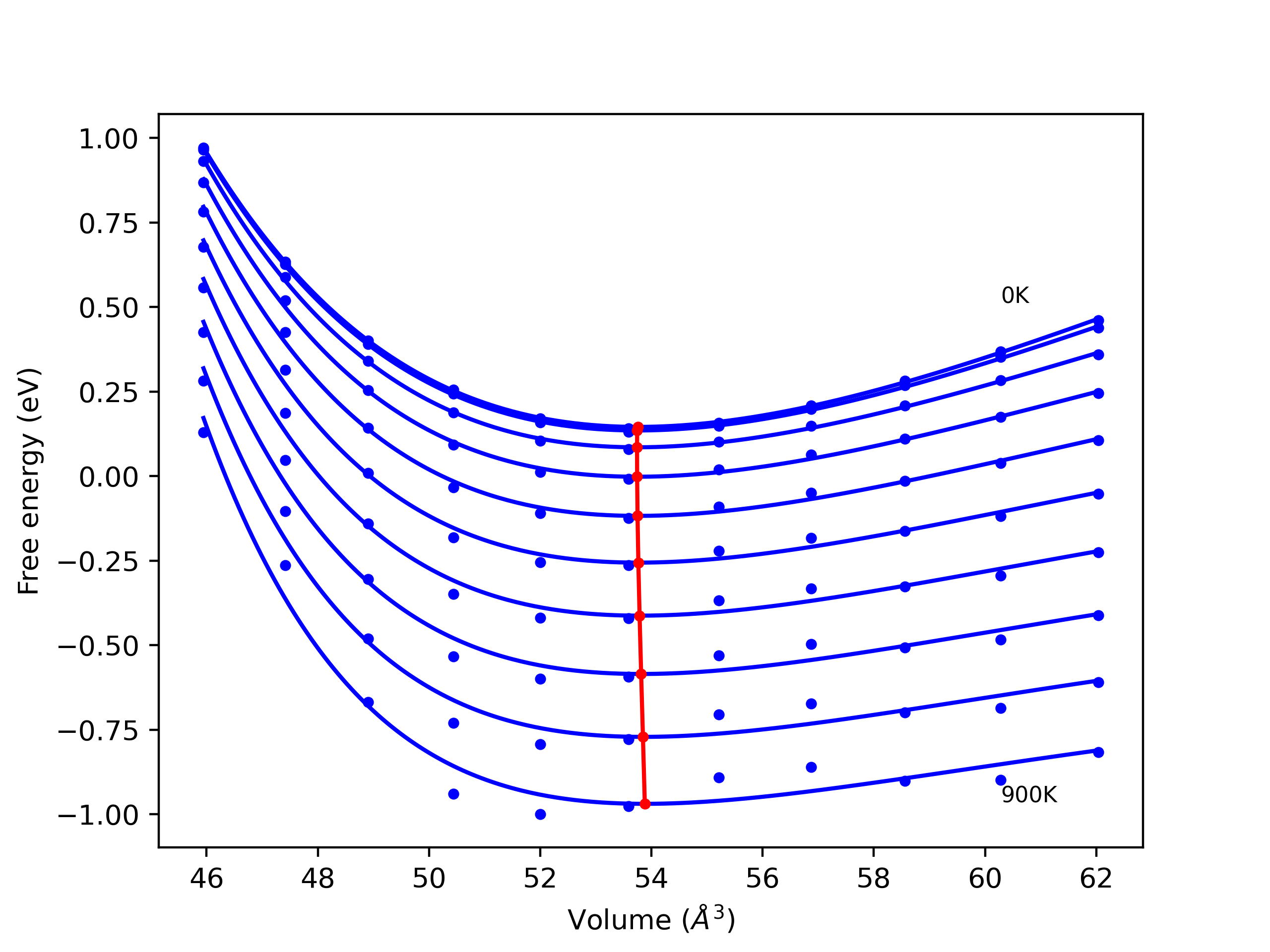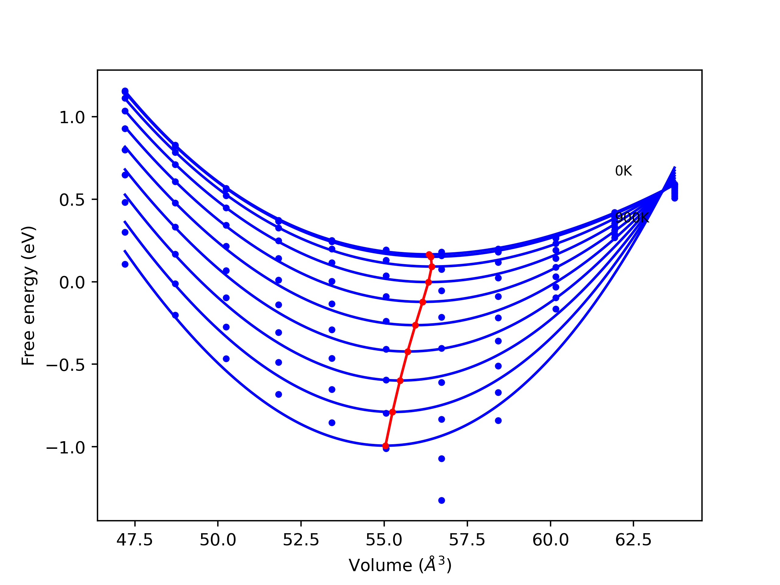 The Gibbs energies of the phases are estimated using thermodynamic integration between the interatomic potential in question and a simpler model with known Gibbs free energy values. For solids, the reference model is an Einstein solid, while for liquids it is the Uhlenbeck-Ford potential. Besides a short run at the start of the solid calculations to estimate Einstein model spring constants, the two calculations proceed similarly. Starting with the final relaxation configurations, the systems are stabilized for 25,000 steps. Then, over the next 50,000 steps the potential is swapped out for the reference potential. The system is then stabilized for another 25,000 steps with the reference model before a reverse swap of 50,000 steps is performed. The simulation ends with one final 25,000 step stabilization period. From the simulation, the irreversible work of transformation is estimated and used to compute the absolute Gibbs free energy of the target phase and potential relative to the reference potential. Entropy is estimated as the difference in enthalpy and Gibbs free energy and divided by temperature.