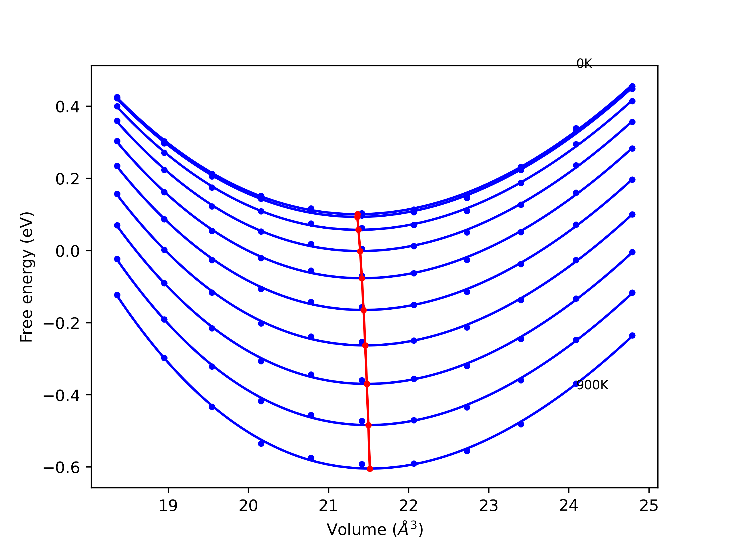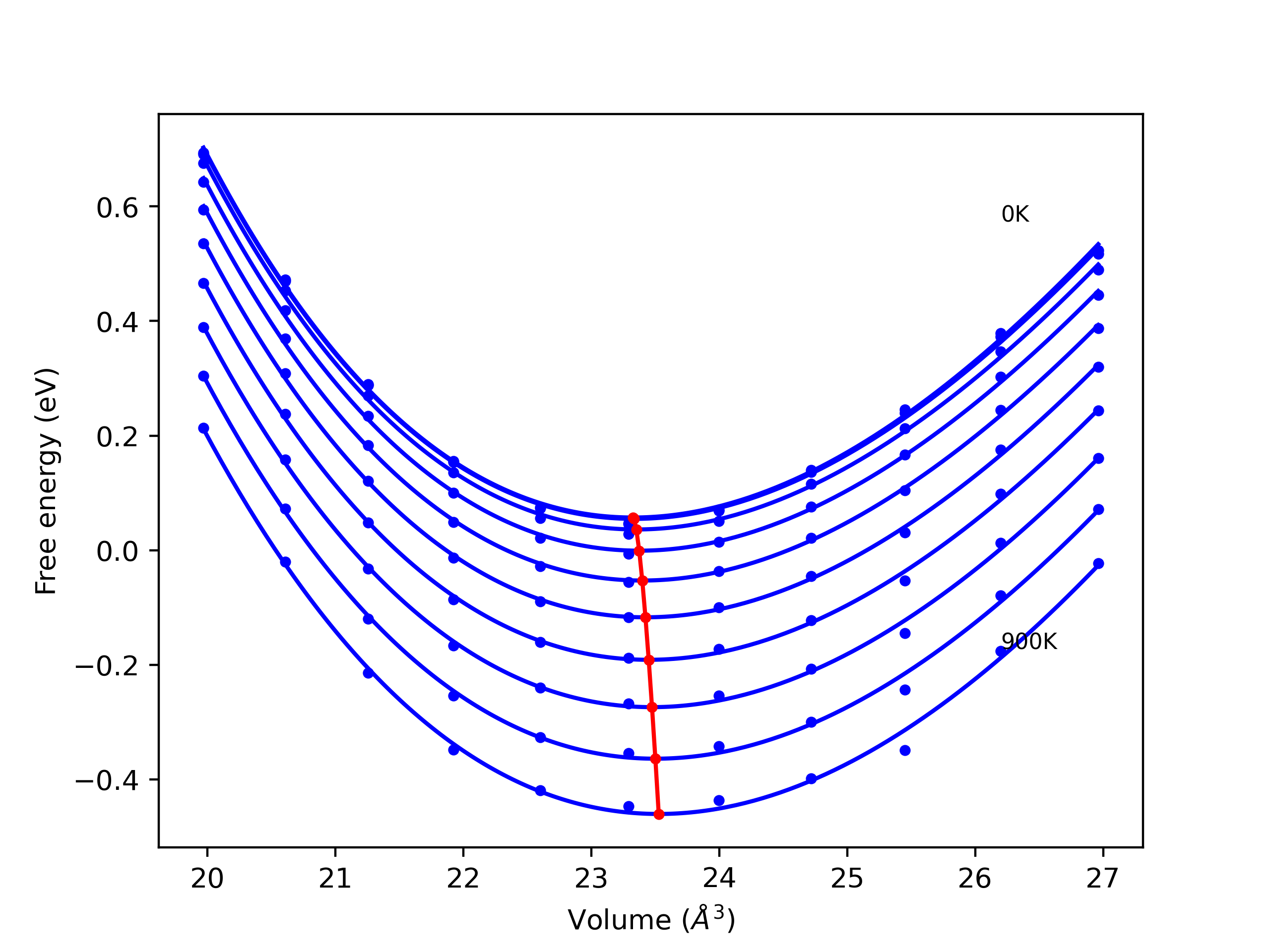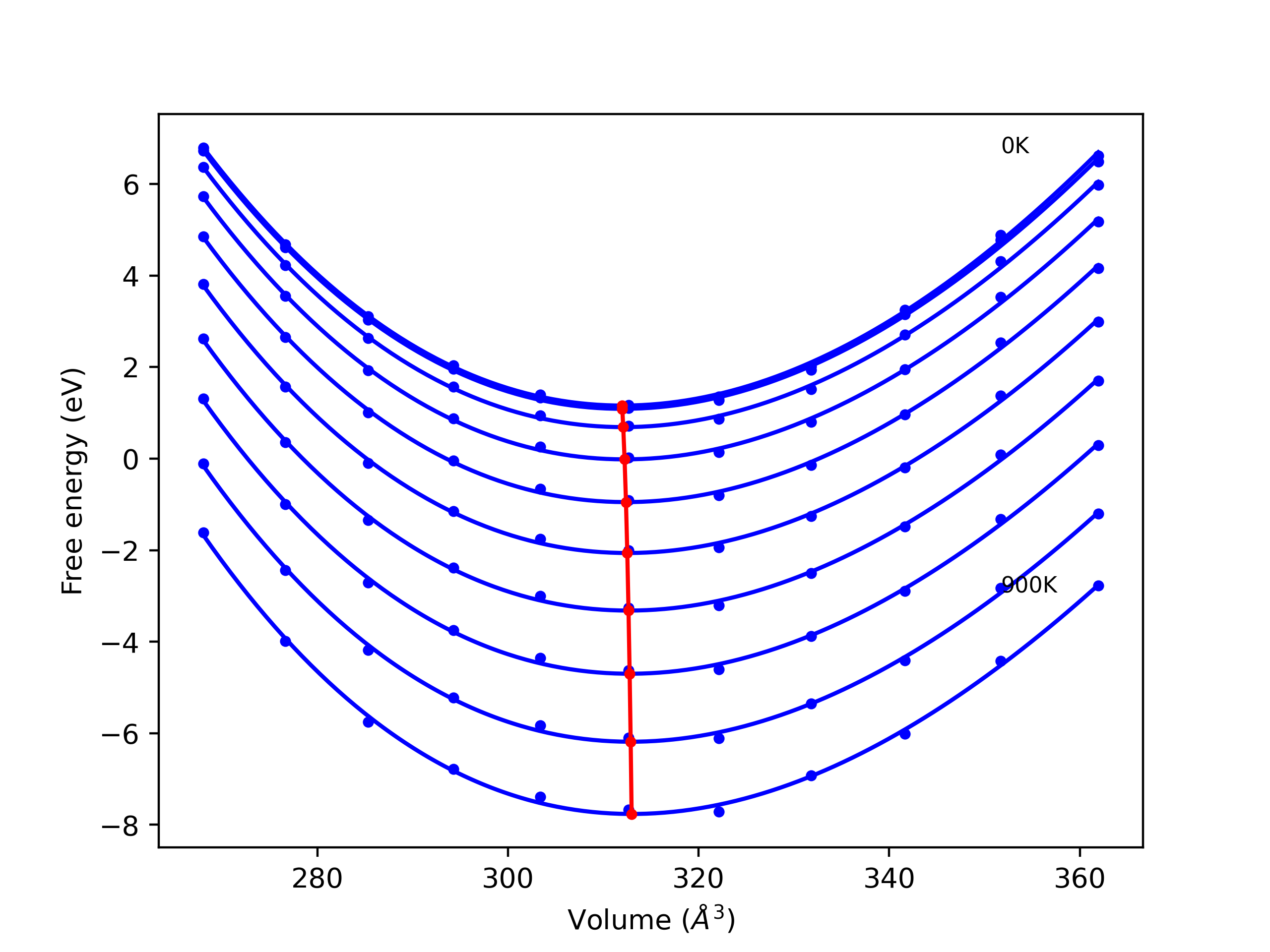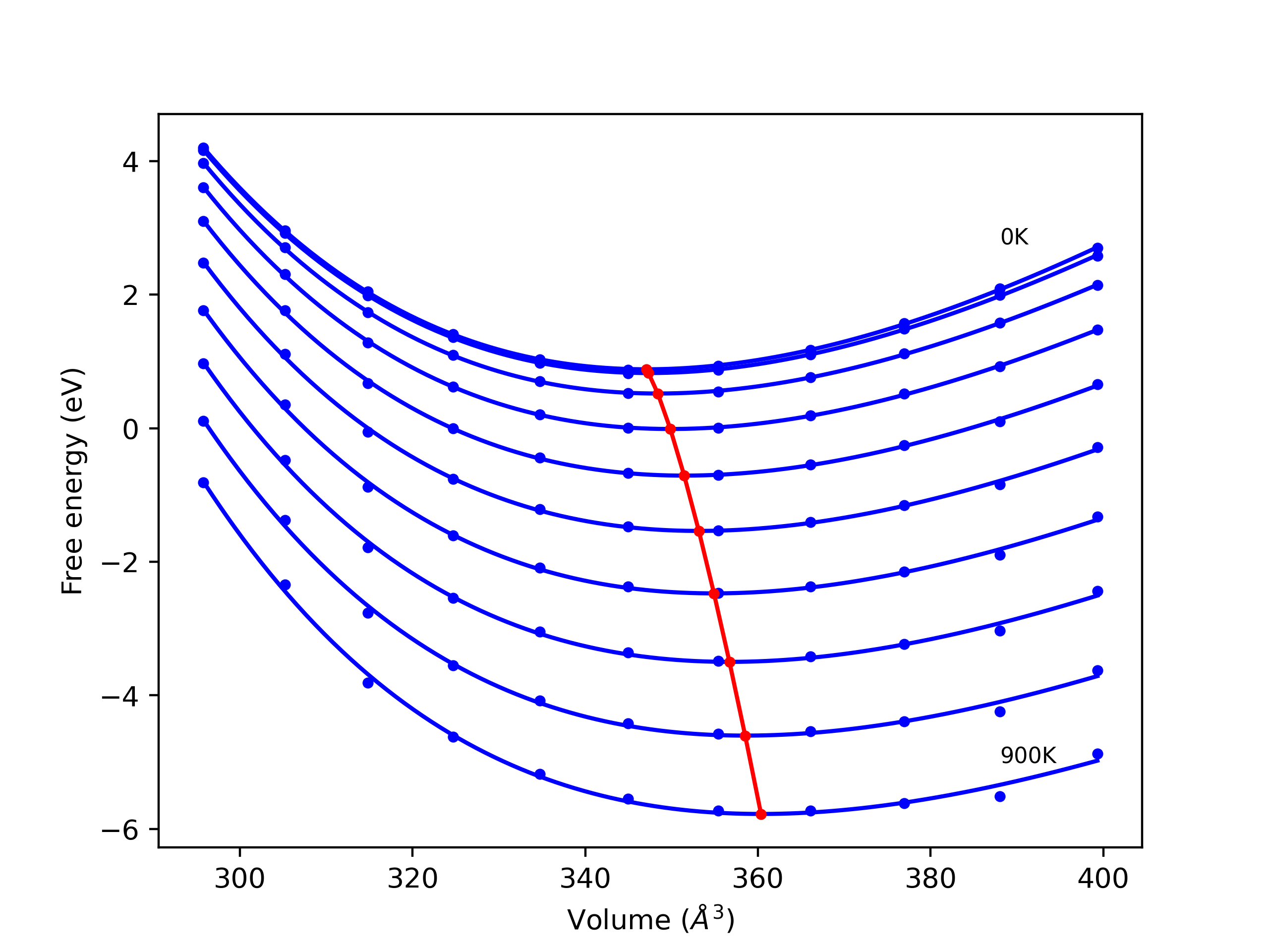 Phonon band structures and crystal properties estimated from quasi-harmonic approximation (QHA) calculations are displayed for select crystals. The calculations were performed using phonopy and LAMMPS. For the phonon calculations, 3x3 supercells of the potential-specific relaxed crystals were used. The QHA calculations were based on 11 strain states ranging from -0.05 to 0.05.