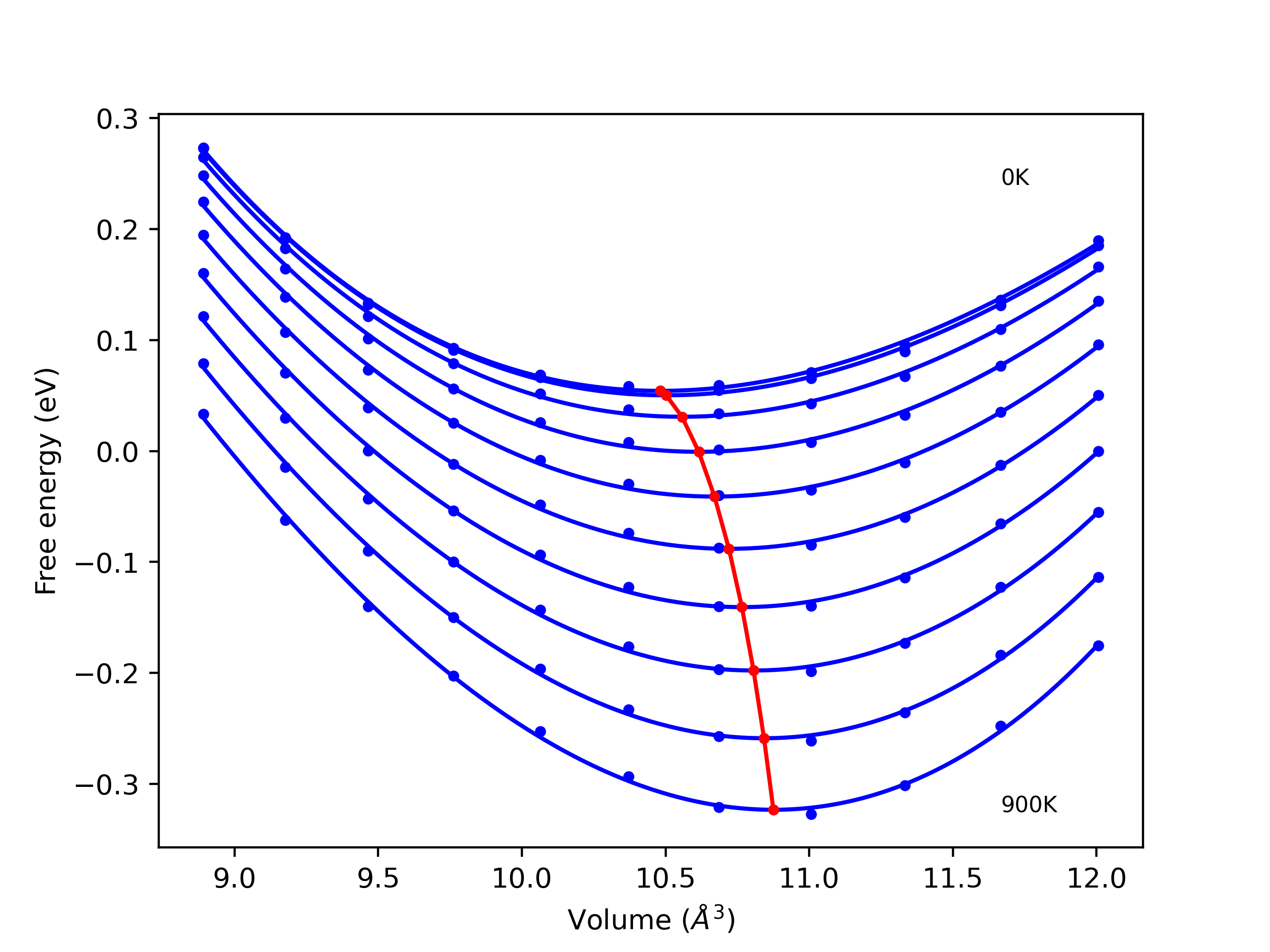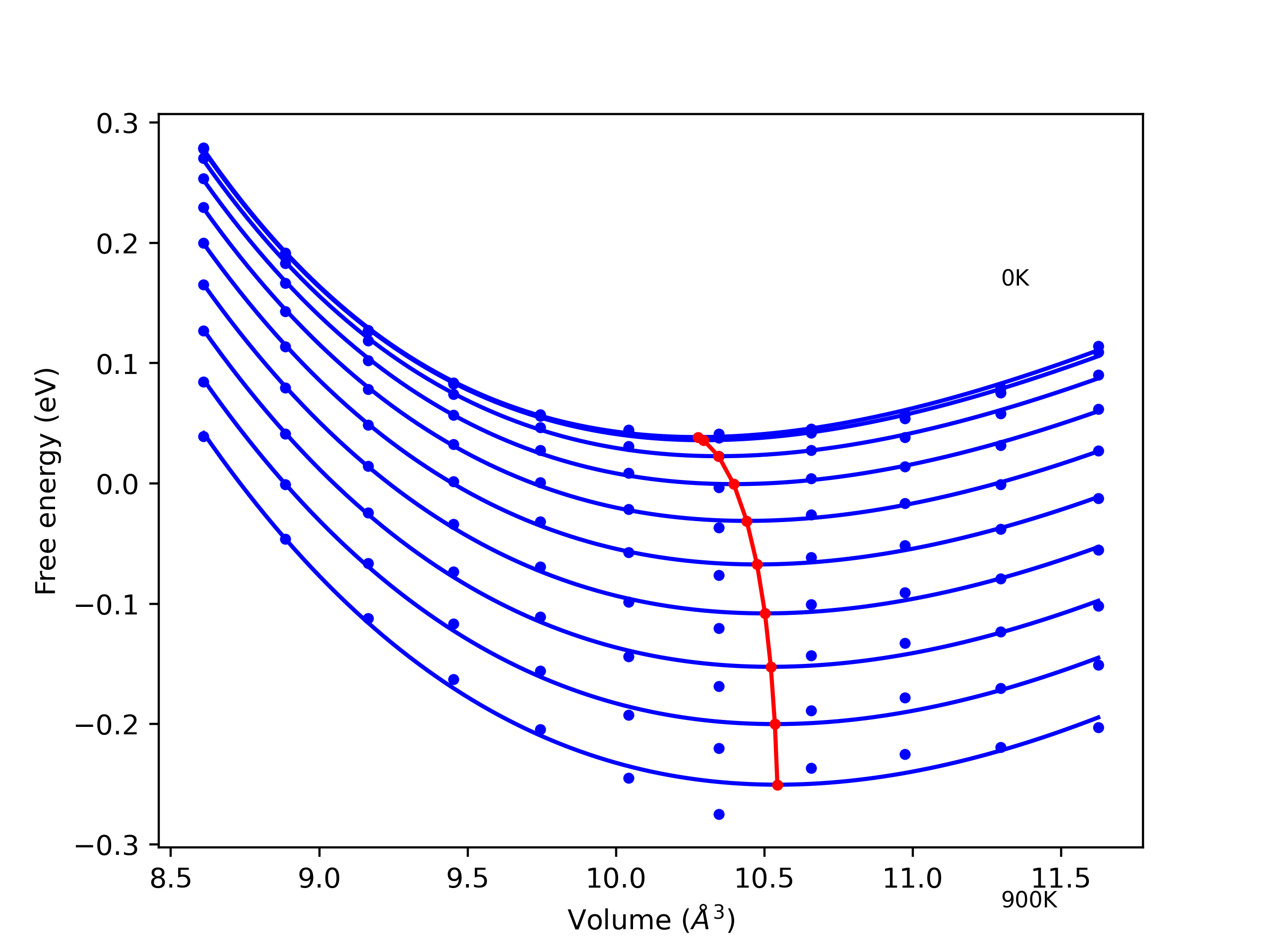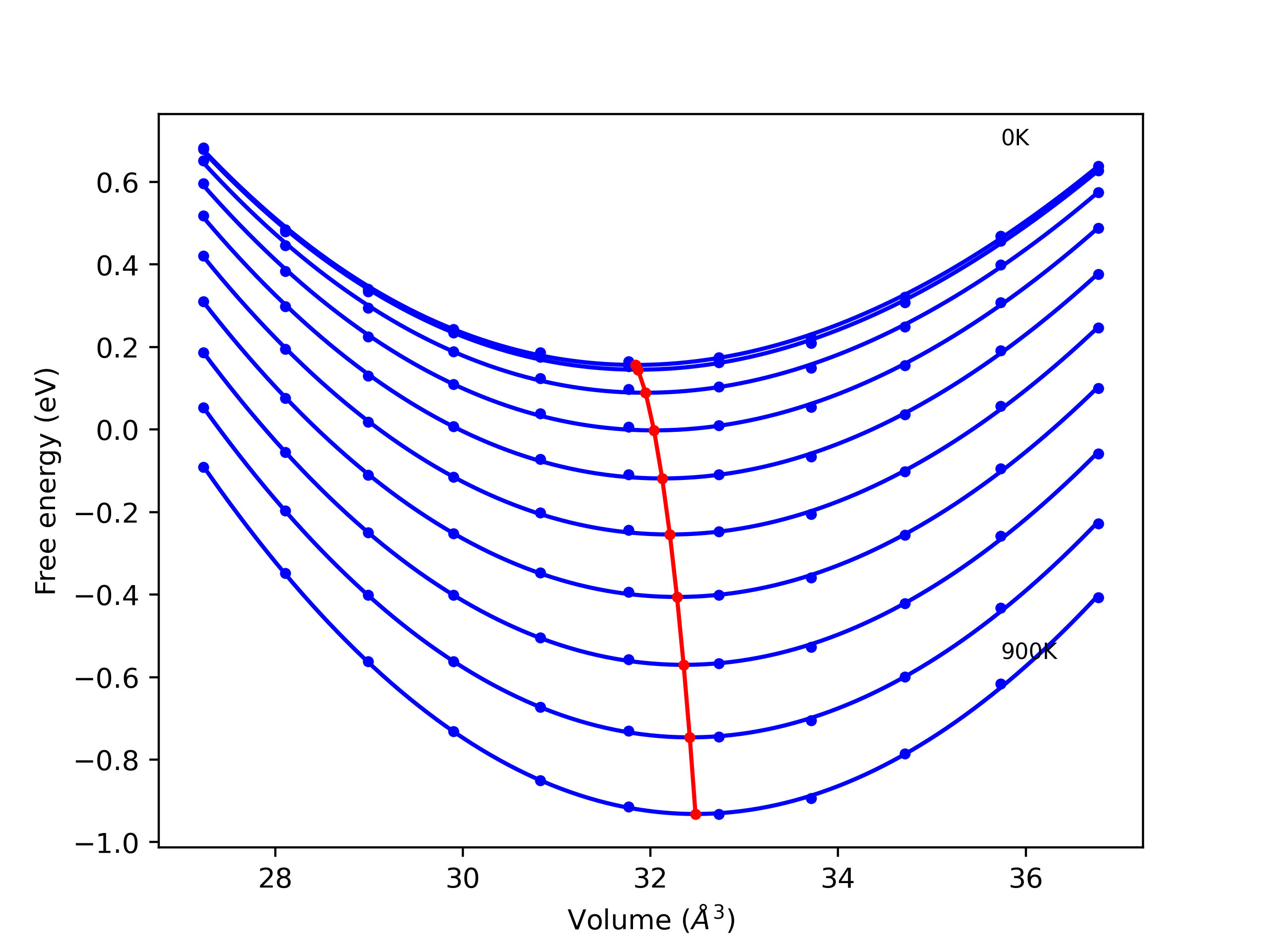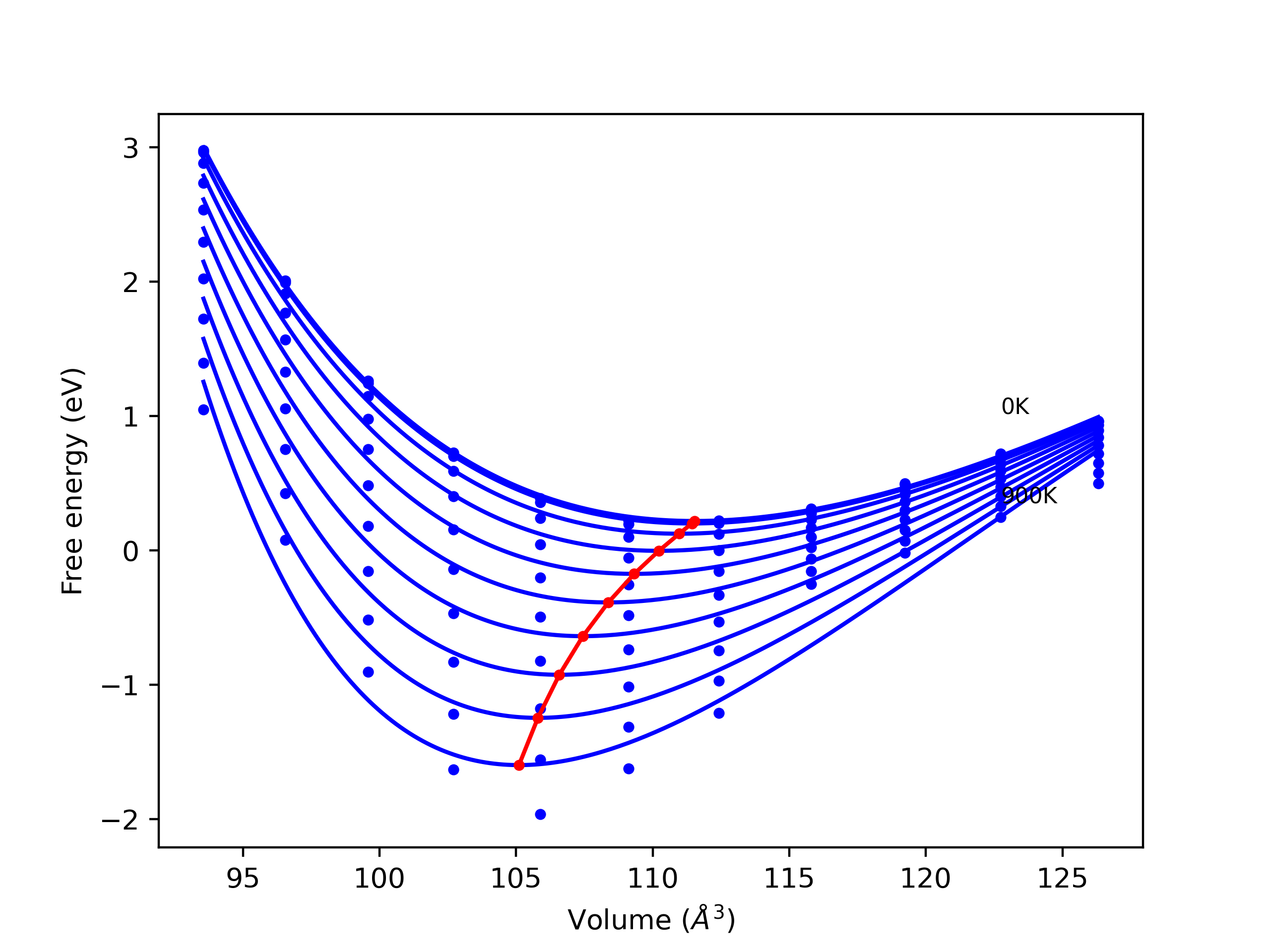 Plots of internal energy, Gibbs free energy, entropy, heat capacity and volume are shown here as a function of temperature for various crystal structures and liquid phases. The included crystal structures correspond to those in the Solid Structures vs. Temperature section, and the liquid phases to those in the Liquid Properties section. Internal energy and volume are taken from the associated structure relaxations mentioned in those previous sections. Constant pressure heat capacity is estimated using 3-point numerical derivatives of enthalpy versus temperature. Note that since all simulations done here are at 0 pressure, internal energy and enthalpy are equivalent.