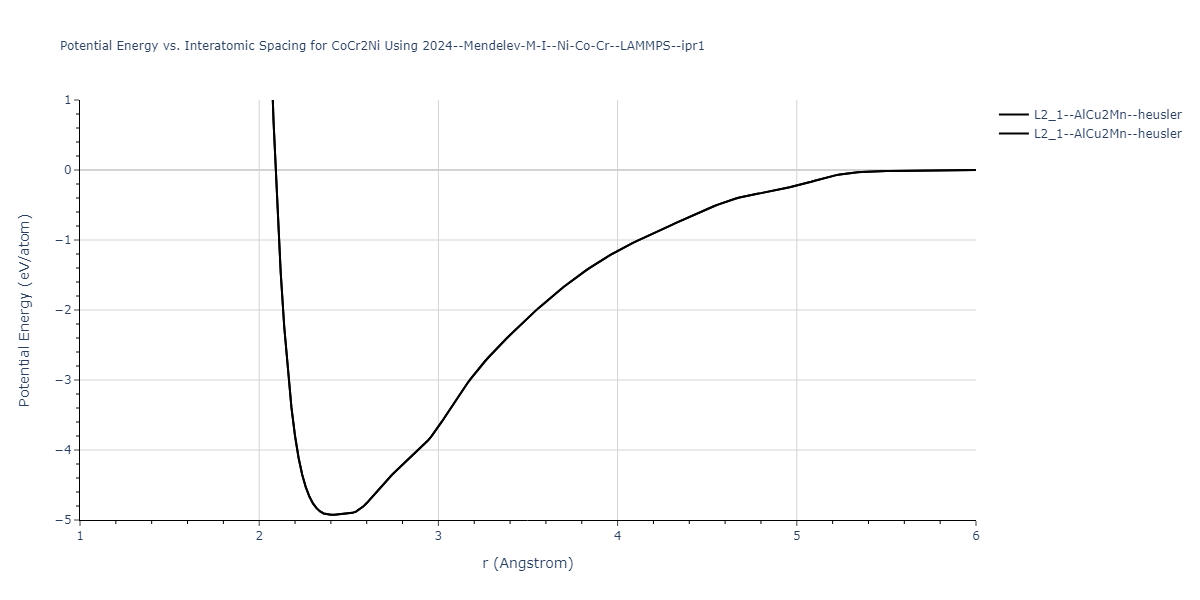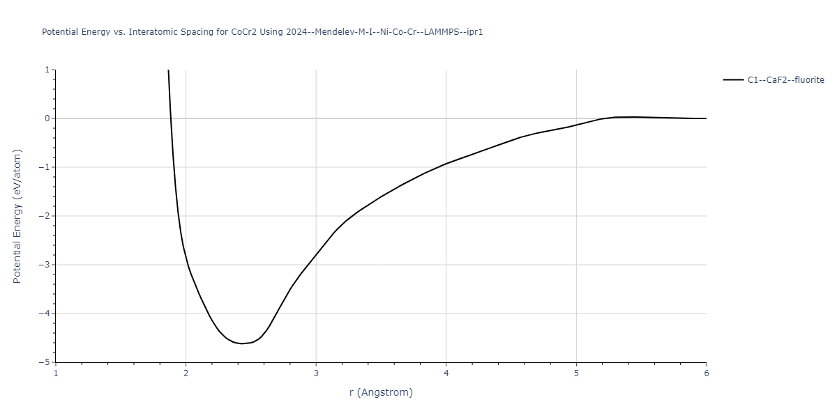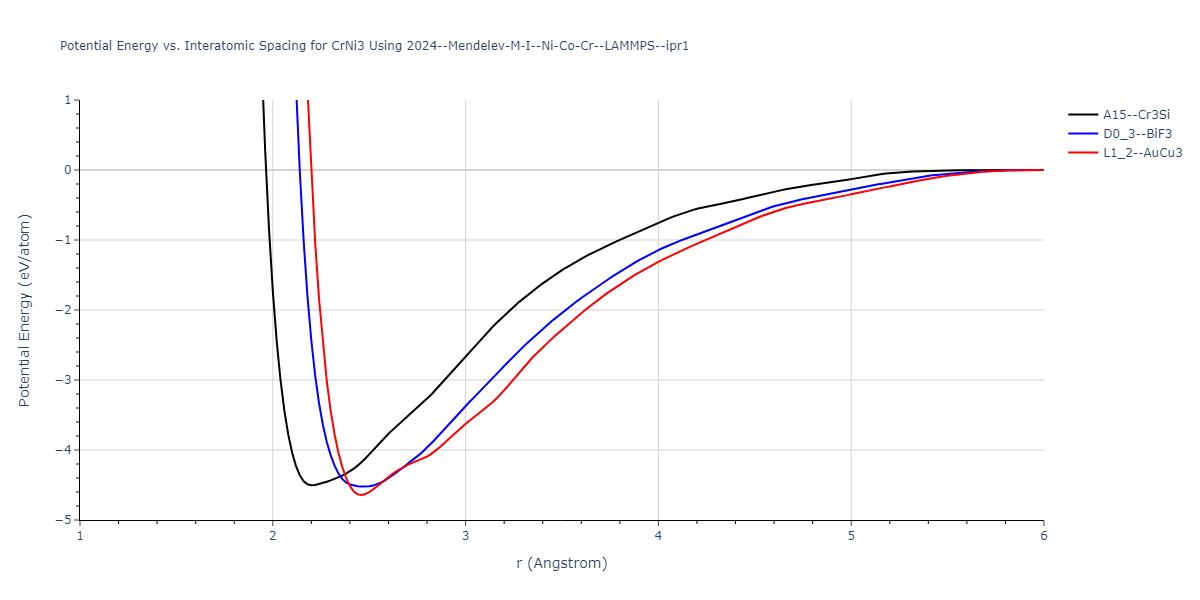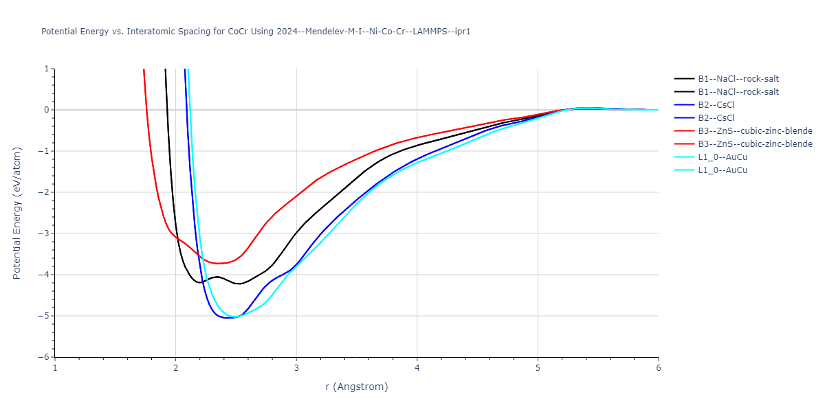 Plots of potential energy vs interatomic spacing, r, are shown below for a number of crystal structures. The structures are generated based on the ideal atomic positions and b/a and c/a lattice parameter ratios for a given crystal prototype. The size of the system is then uniformly scaled, and the energy calculated without relaxing the system. To obtain these plots, values of r are evaluated every 0.02 Å up to 6 Å.