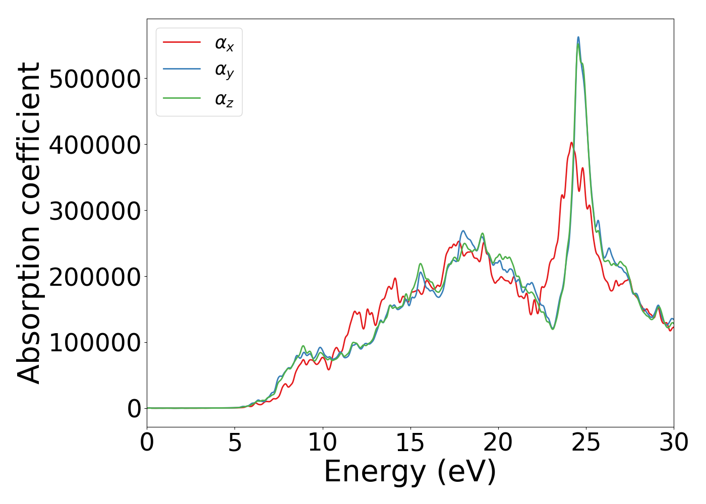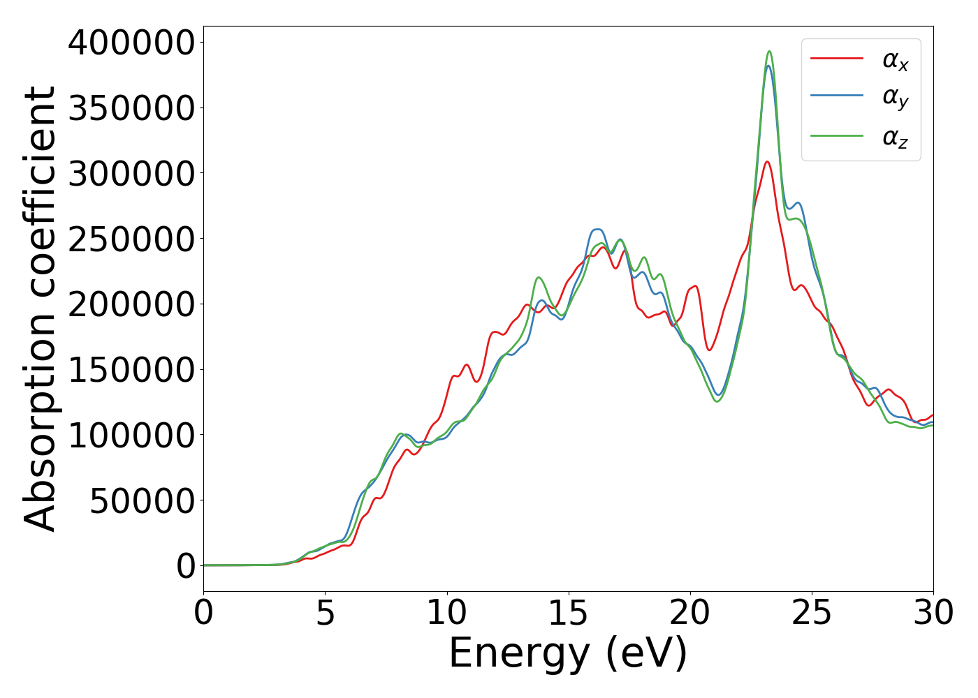 Incident photon energy dependence of optical is shown below [Source-code]. Only interband optical transitions are taken into account.Please note the underestimatation of band-gap problem with DFT will reflect in the spectra as well. For very accurate optical properties GW/BSE calculation would be needed, which is yet to be done because of their very high computational cost. Optical properties for mono-/multi-layer materials were rescaled with the actual thickness to simulation z-box ratio. Absorption coeffiecient is in cm-1 unit. Also, ionic contributions were neglected.