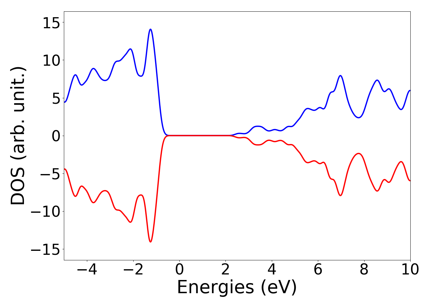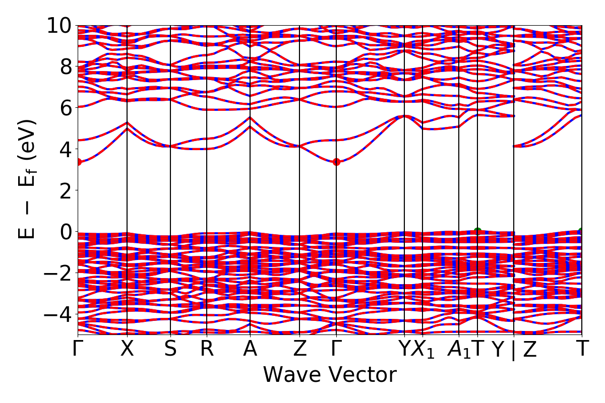 The following shows the electronic density of states and bandstructure [Source-code]. DFT is generally predicted to underestimate bandgap of materials. Accurate band-gaps are obtained with higher level methods (with high computational requirement) such as HSE, GW , which are under progress. If available, MBJ data should be comparable to experiments also. Total DOS, Orbital DOS and Element dos [Source-code] buttons are provided for density of states options. Energy is rescaled to make Fermi-energy zero. In the bandstructure plot [Source-code], spin up is shown with blue lines while spin down are shown with red lines. Non-degenerate spin-up and spin-down states (if applicable) would imply a net orbital magnetic moment in the system. Fermi-occupation tolerance for bandgap calculation is chosen as 0.001.