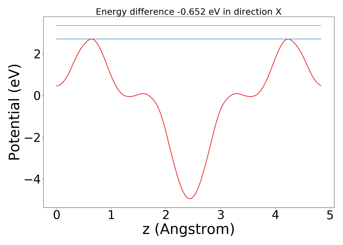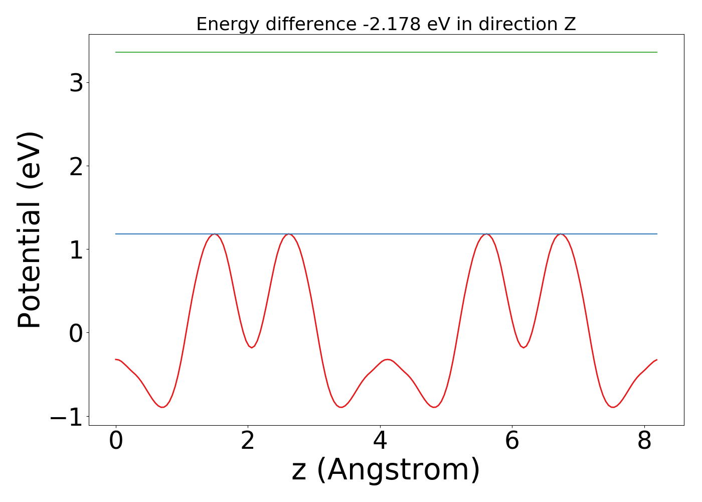 The following plot shows the plane averaged electrostatic potential (ionic+Hartree) along x, y and z-directions. The red line shows the Fermi-energy while the green line shows the maximum value of the electrostatic potential. For slab structures (with vacuum along z-direction), the difference in these two values can be used to calculate work-function of the material.