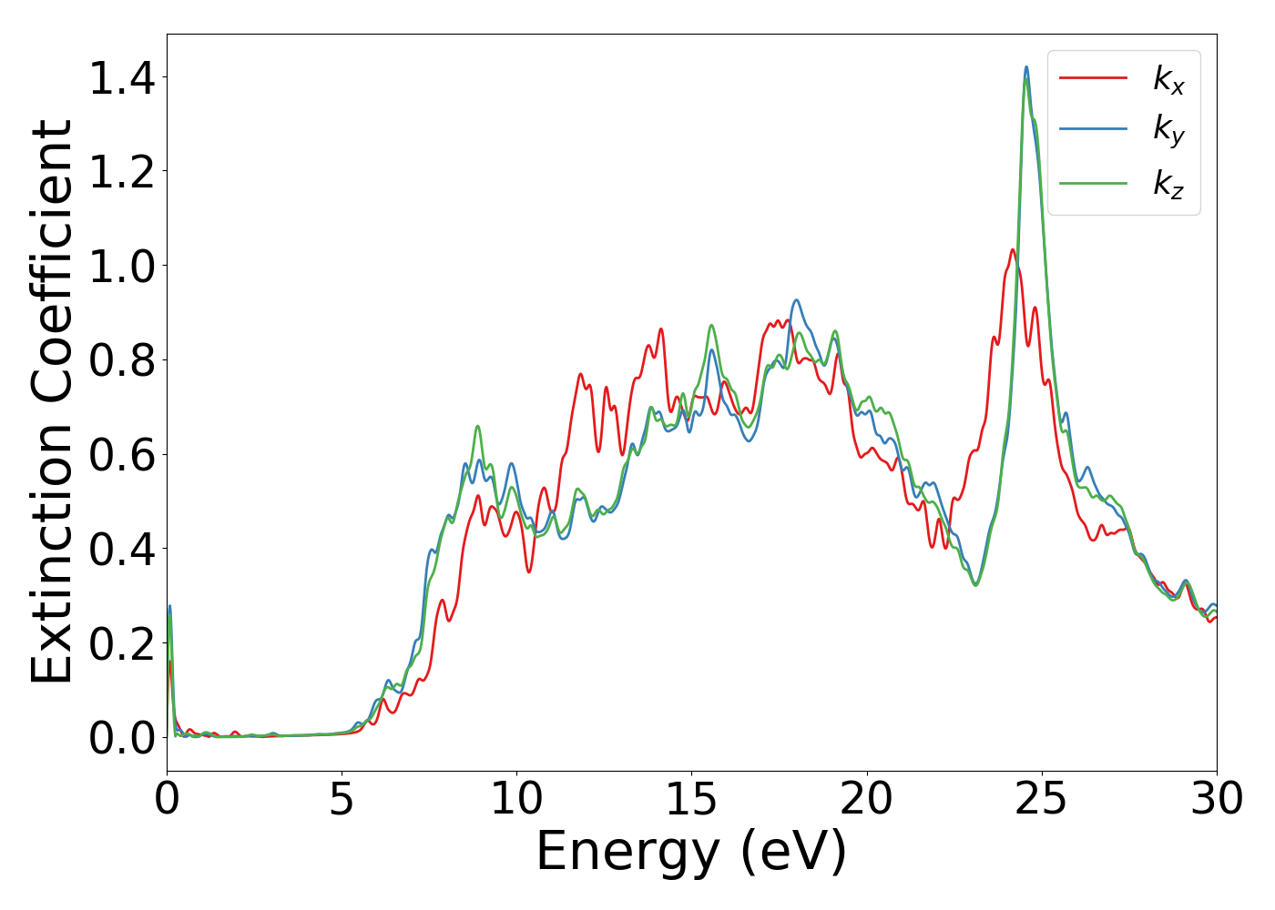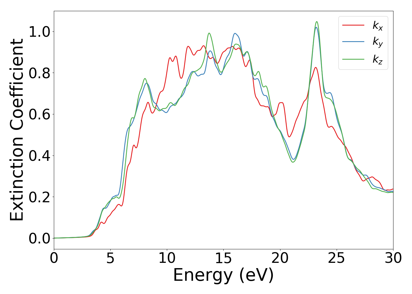 Single point DFT calculation was carried out with meta-gga MBJ potential [Source-code]. This should give reasonable bandgap, and optical properties assuming the calculation was properly converged. Incident photon energy dependence of optical is shown below. Only interband optical transitions are taken into account. Also, ionic contributions were neglected.