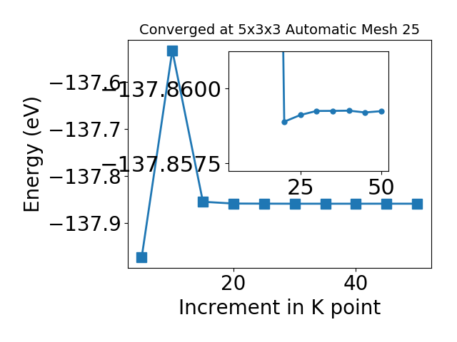 Calculations are done using VASP software [Source-code]. Convergence on KPOINTS [Source-code] and ENCUT [Source-code] is done with respect to total energy of the system within 0.001 eV tolerance. Please note convergence on KPOINTS and ENCUT is generally done for target properties, but here we assume energy-convergence with 0.001 eV should be sufficient for other properties also. The points on the curves are obtained with single-point calculation (number of ionic steps, NSW=1 ). However, for very accurate calculations, NSW>1 might be needed.