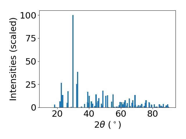 The following shows the X-ray diffraction (XRD)[Source-code] pattern and the Radial distribution function (RDF) plots [Source-code]. XRD peaks should be comparable to experiments for bulk structures. Relative intensities may differ. For mono- and multi-layer structures , we take the z-dimension during DFT calculation for XRD calculations, which may differ from the experimental set-up.