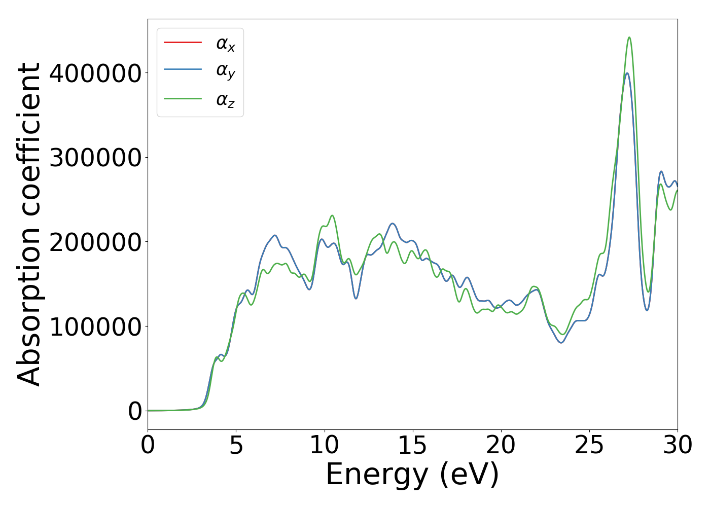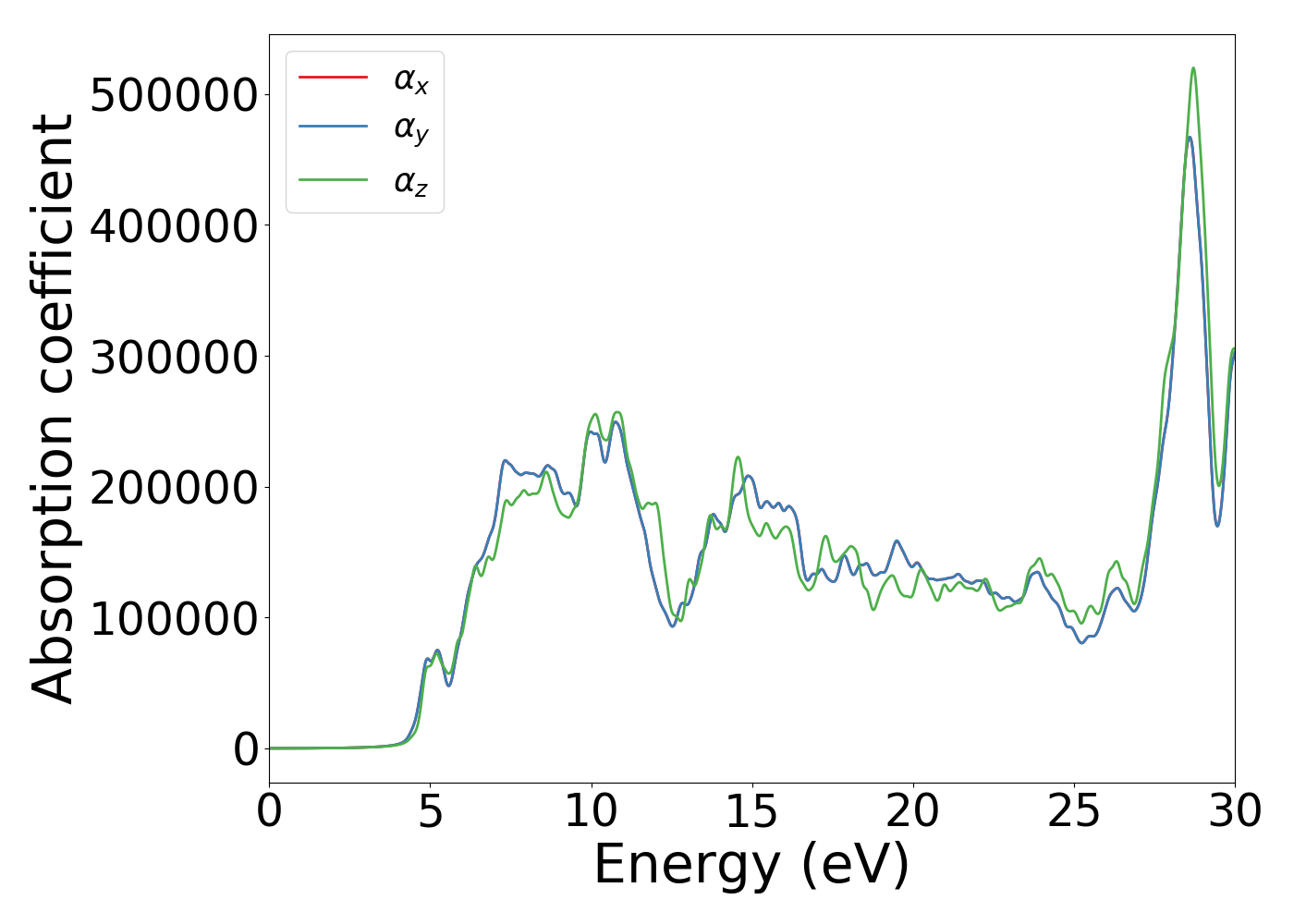 Incident photon energy dependence of optical is shown below [Source-code]. Only interband optical transitions are taken into account.Please note the underestimatation of band-gap problem with DFT will reflect in the spectra as well. For very accurate optical properties GW/BSE calculation would be needed, which is yet to be done because of their very high computational cost. Optical properties for mono-/multi-layer materials were rescaled with the actual thickness to simulation z-box ratio. Absorption coeffiecient is in cm-1 unit. Also, ionic contributions were neglected.