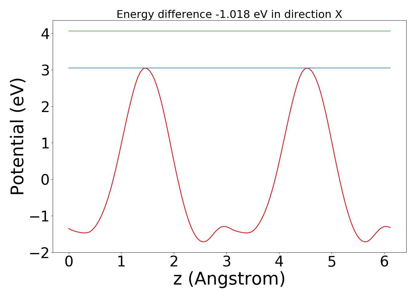 The following plot shows the plane averaged electrostatic potential (ionic+Hartree) along x, y and z-directions. The red line shows the Fermi-energy while the green line shows the maximum value of the electrostatic potential. For slab structures (with vacuum along z-direction), the difference in these two values can be used to calculate work-function of the material.