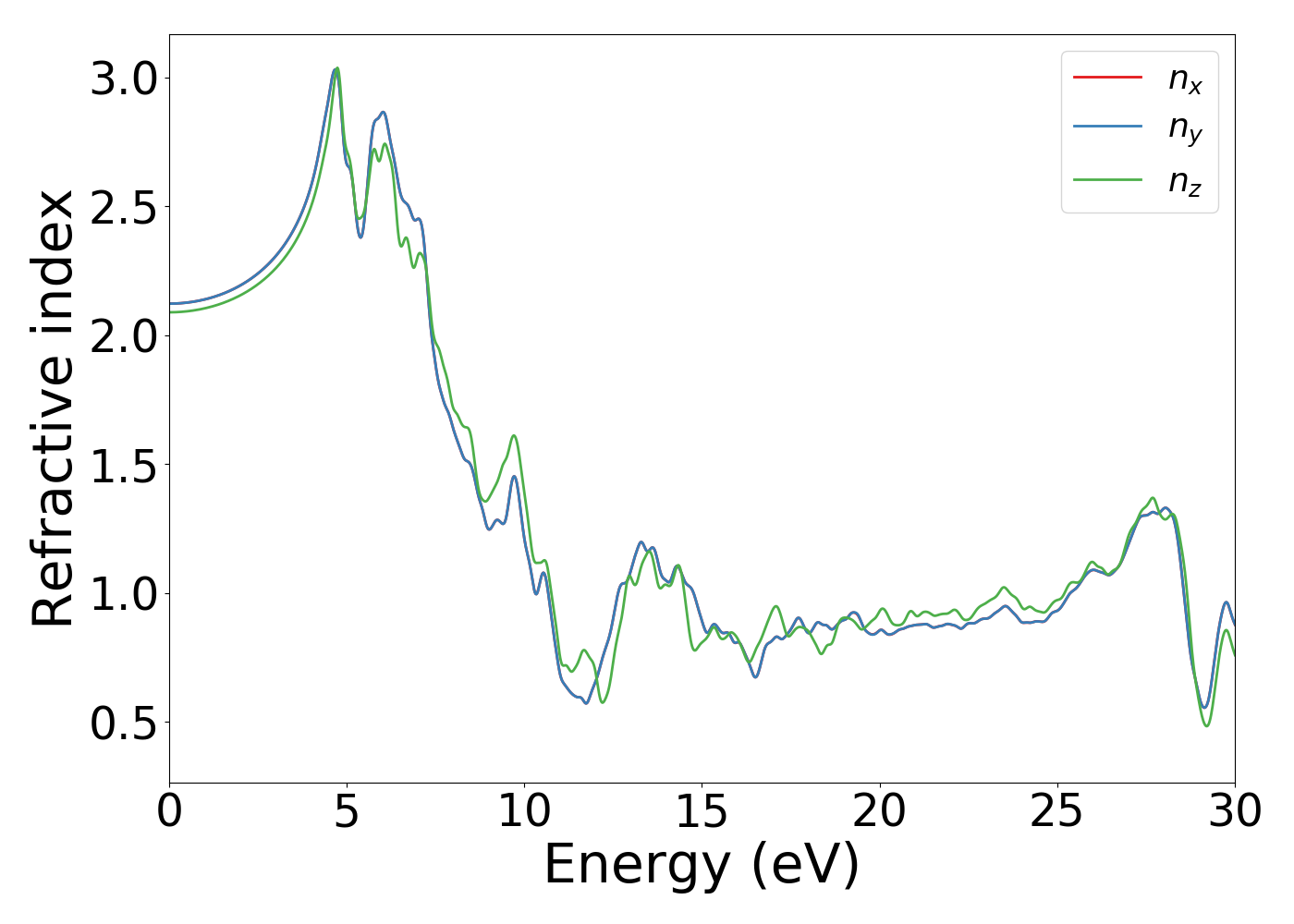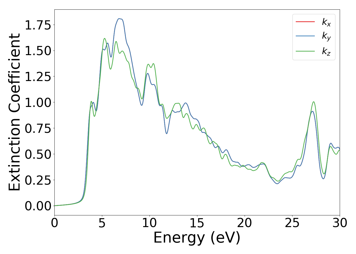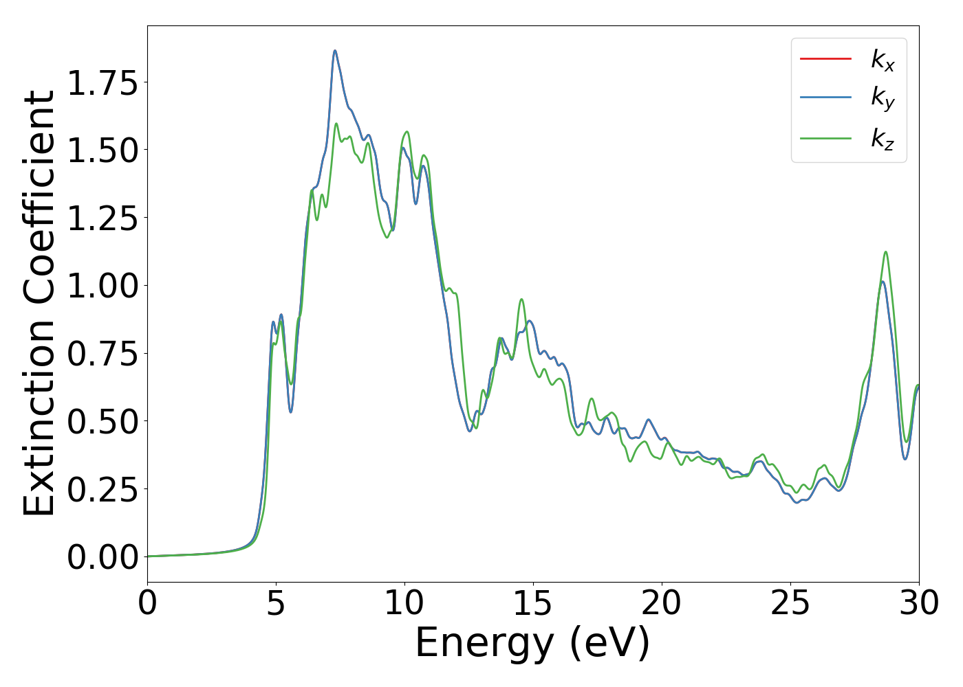 Single point DFT calculation was carried out with meta-gga MBJ potential [Source-code]. This should give reasonable bandgap, and optical properties assuming the calculation was properly converged. Incident photon energy dependence of optical is shown below. Only interband optical transitions are taken into account. Also, ionic contributions were neglected.
