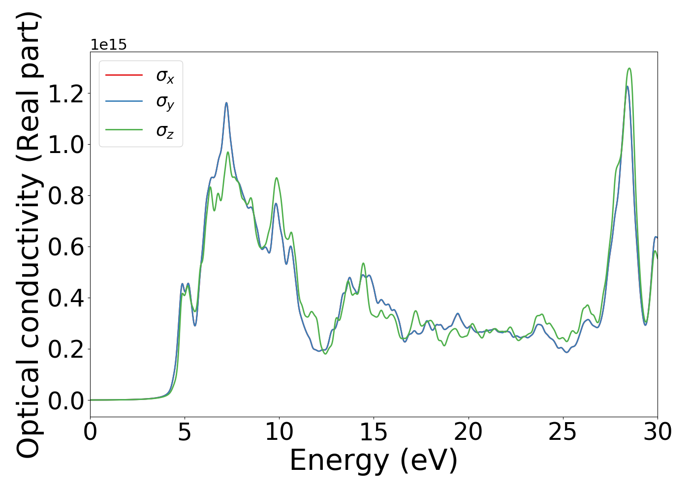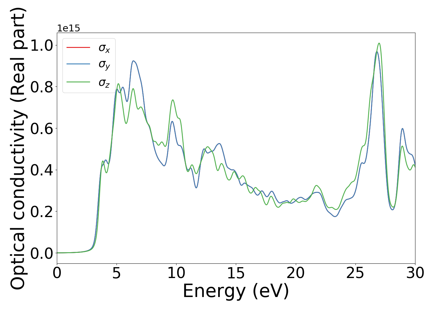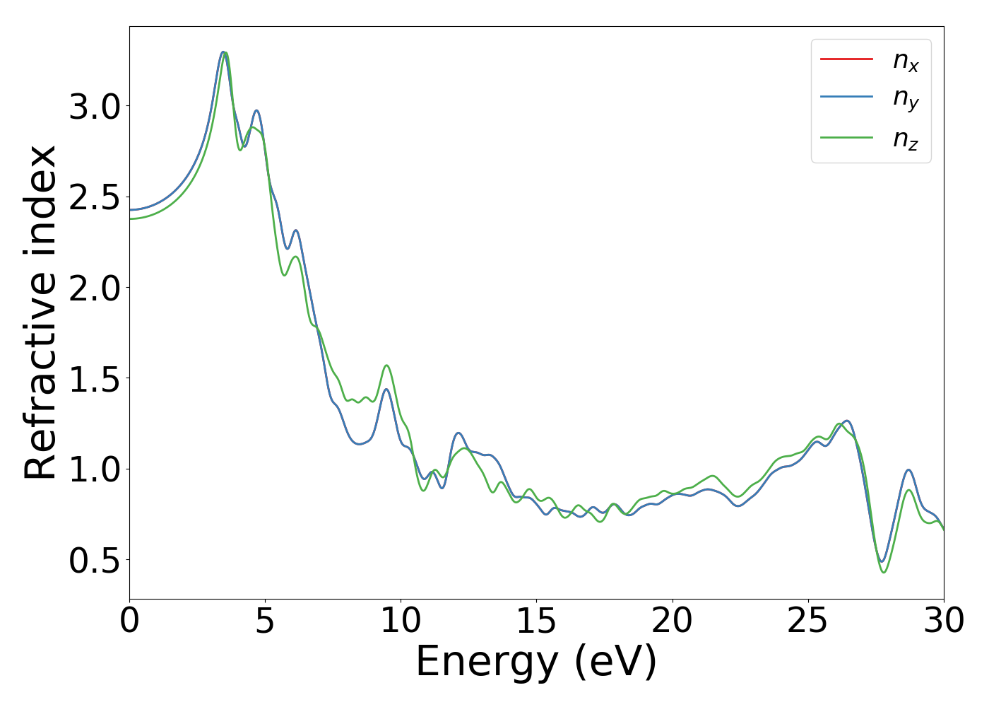 Single point DFT calculation was carried out with meta-gga MBJ potential [Source-code]. This should give reasonable bandgap, and optical properties assuming the calculation was properly converged. Incident photon energy dependence of optical is shown below. Only interband optical transitions are taken into account. Also, ionic contributions were neglected.