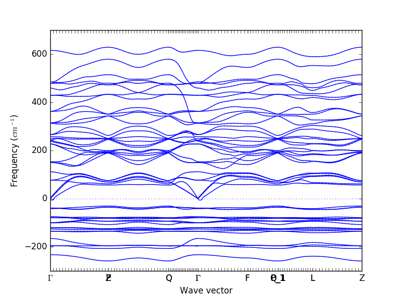 WARNING: Please note we provide finite-size cell phonons only. At least 1.2 nm x1.2 nm x1.2 nm size cell or more is generally needed for obtaining reliable phonon spectrum, but we take conventional cell of the structure only. For systems having primitive-cell phonon representation tables, I denotes infrared activity and R denotes Raman active modes (where applicabale). Selection of particular q-point mesh can give rise to unphysical negative modes in phonon density of states and phonon bandstructre. The minimum thermal conductivity was calculated using elastic tensor information following Clarke and Cahill formalism.