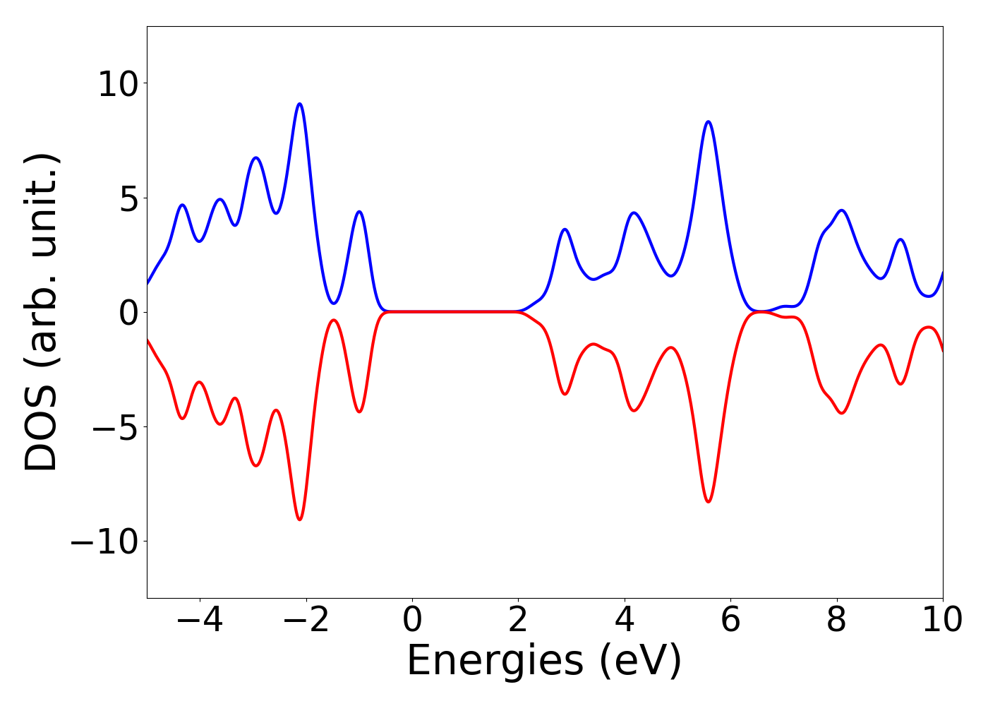 The following shows the electronic density of states and bandstructure [Source-code]. DFT is generally predicted to underestimate bandgap of materials. Accurate band-gaps are obtained with higher level methods (with high computational requirement) such as HSE, GW , which are under progress. If available, MBJ data should be comparable to experiments also. Total DOS, Orbital DOS and Element dos [Source-code] buttons are provided for density of states options. Energy is rescaled to make Fermi-energy zero. In the bandstructure plot [Source-code], spin up is shown with blue lines while spin down are shown with red lines. Non-degenerate spin-up and spin-down states (if applicable) would imply a net orbital magnetic moment in the system. Fermi-occupation tolerance for bandgap calculation is chosen as 0.001.