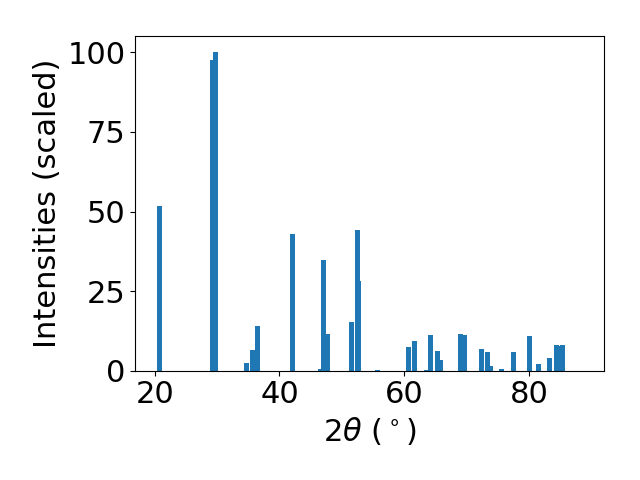 The following shows the X-ray diffraction (XRD)[Source-code] pattern and the Radial distribution function (RDF) plots [Source-code]. XRD peaks should be comparable to experiments for bulk structures. Relative intensities may differ. For mono- and multi-layer structures , we take the z-dimension during DFT calculation for XRD calculations, which may differ from the experimental set-up.