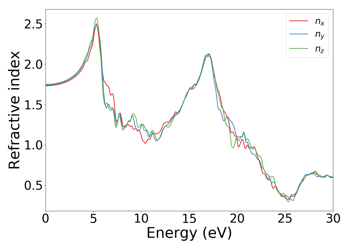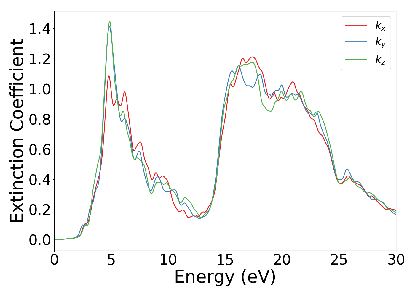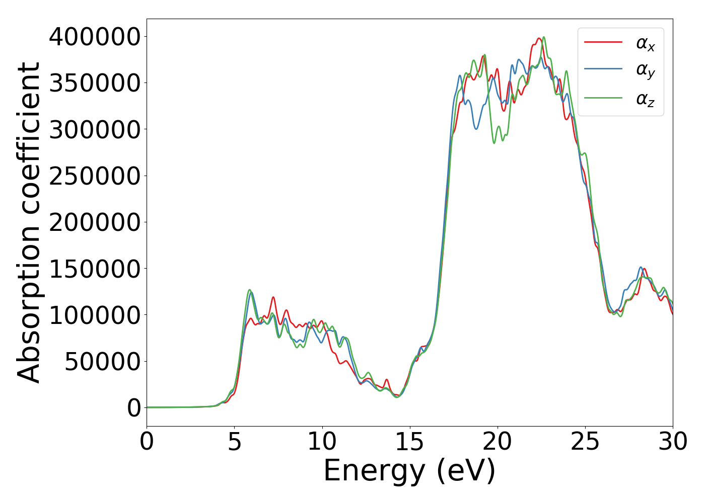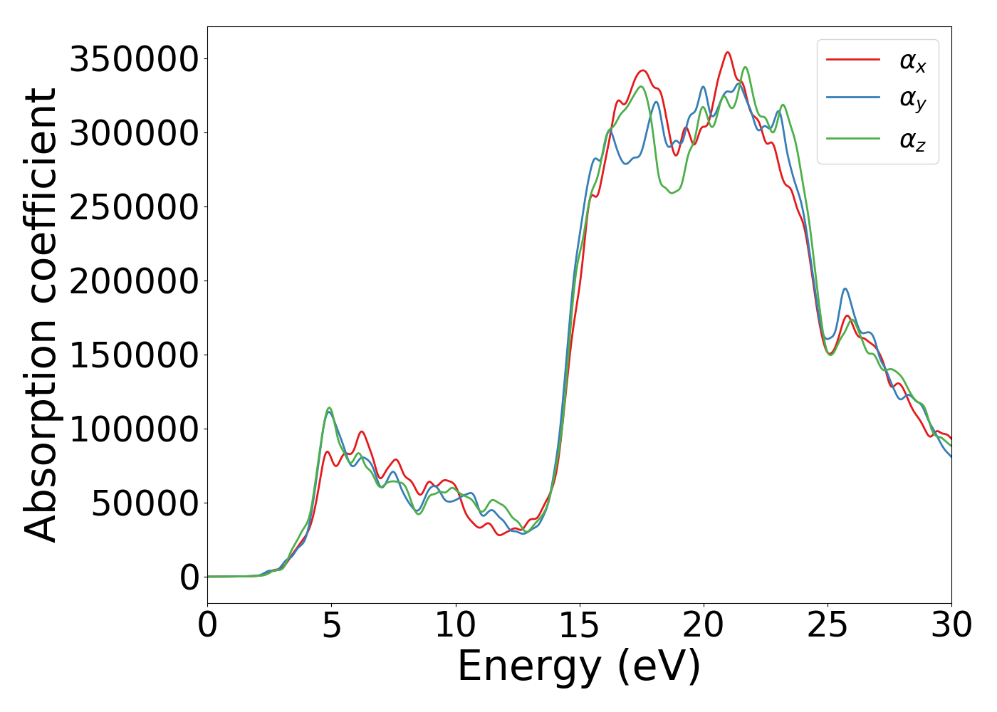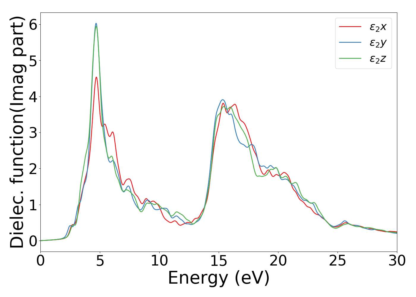 Single point DFT calculation was carried out with meta-gga MBJ potential [Source-code]. This should give reasonable bandgap, and optical properties assuming the calculation was properly converged. Incident photon energy dependence of optical is shown below. Only interband optical transitions are taken into account. Also, ionic contributions were neglected.