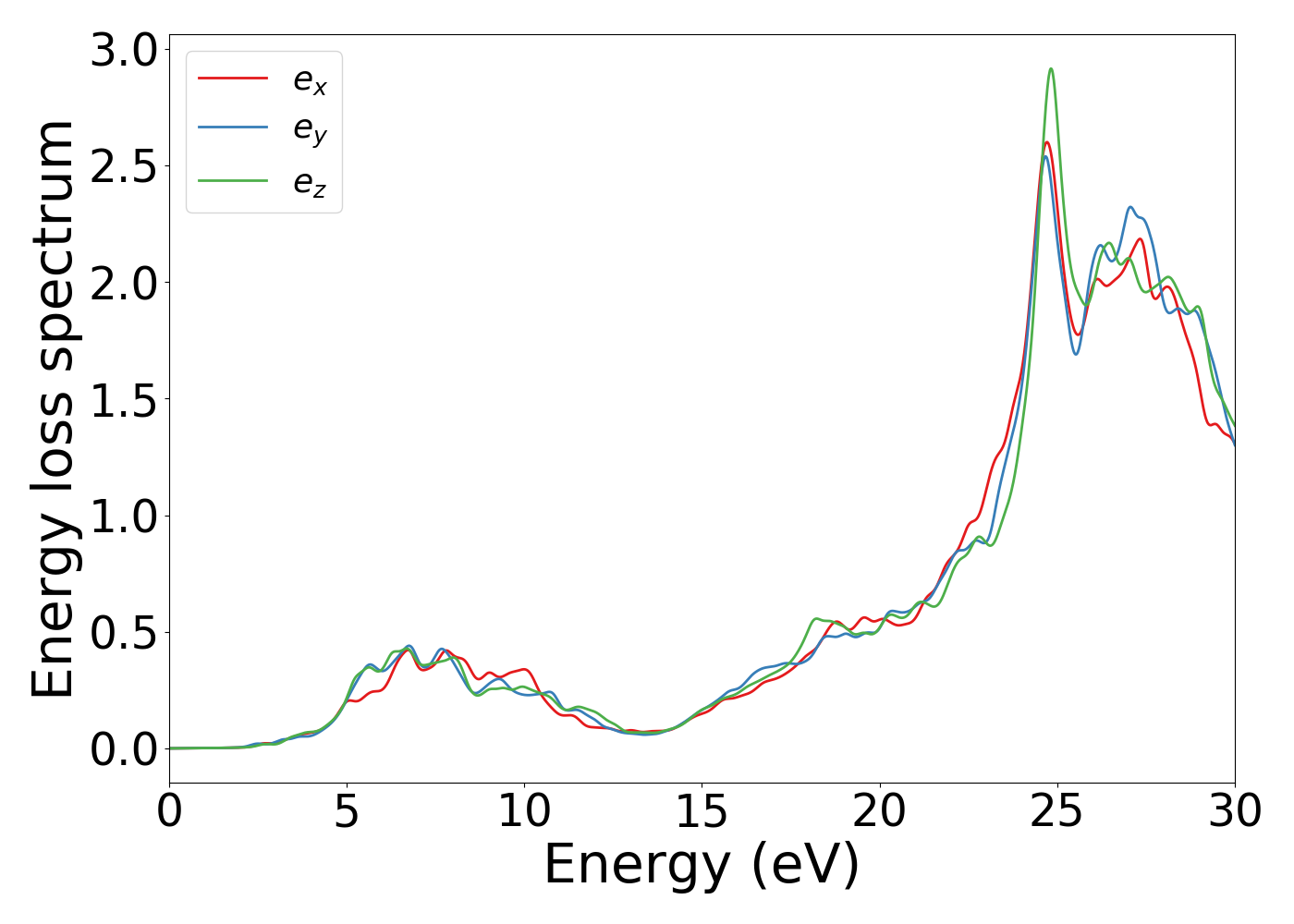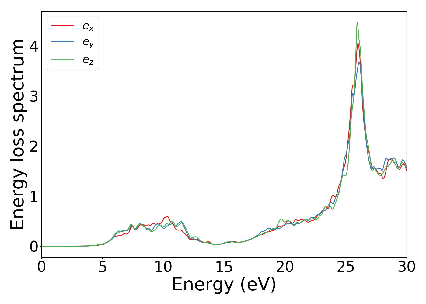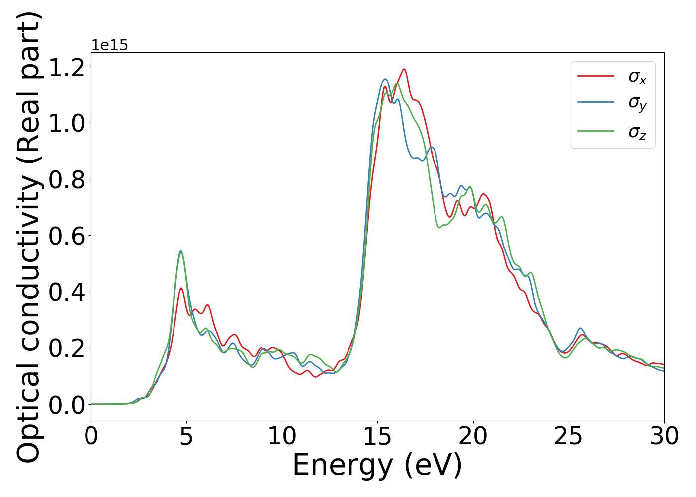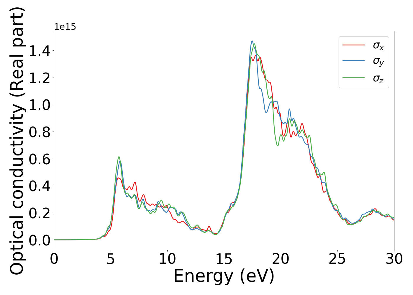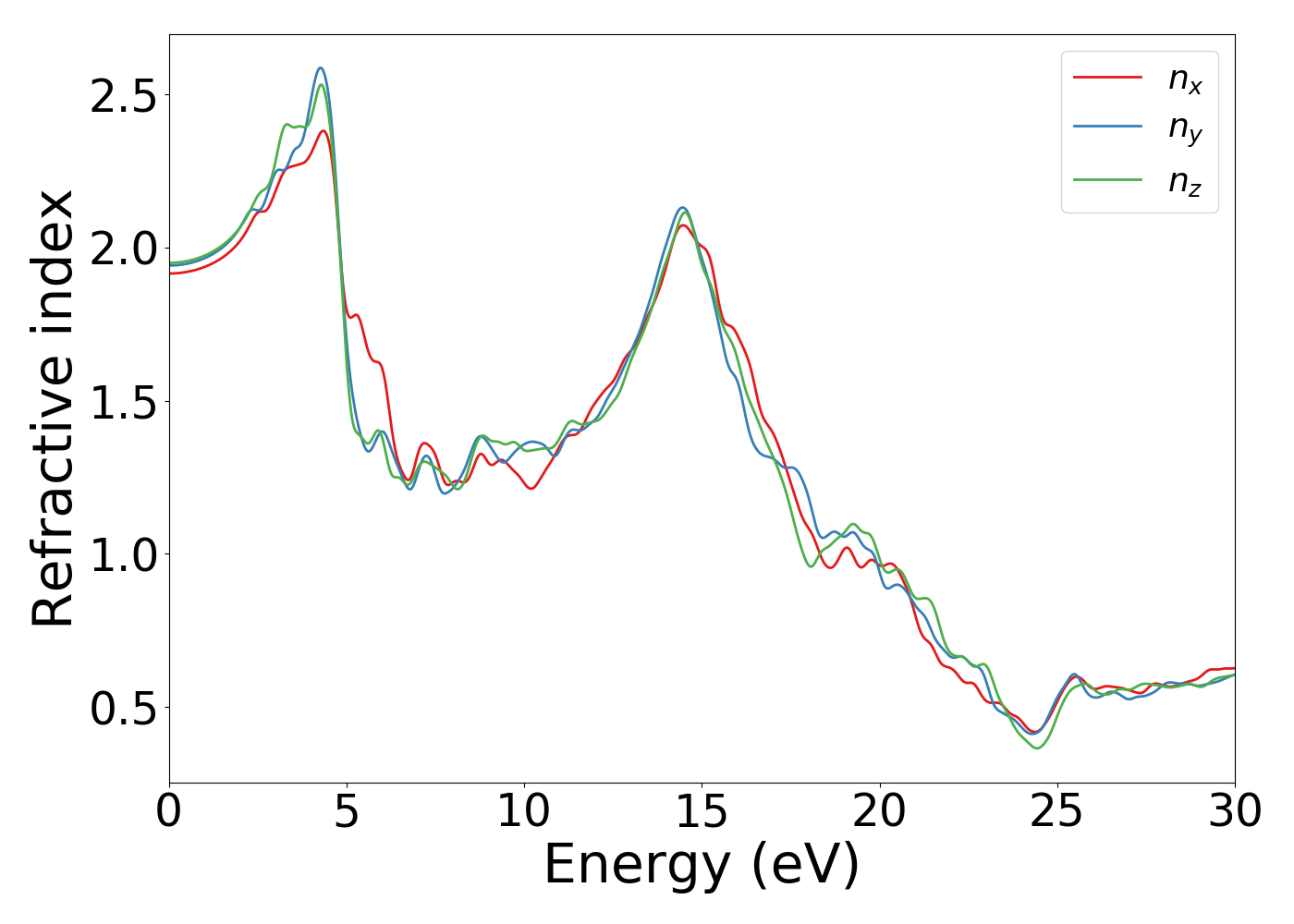 Single point DFT calculation was carried out with meta-gga MBJ potential [Source-code]. This should give reasonable bandgap, and optical properties assuming the calculation was properly converged. Incident photon energy dependence of optical is shown below. Only interband optical transitions are taken into account. Also, ionic contributions were neglected.