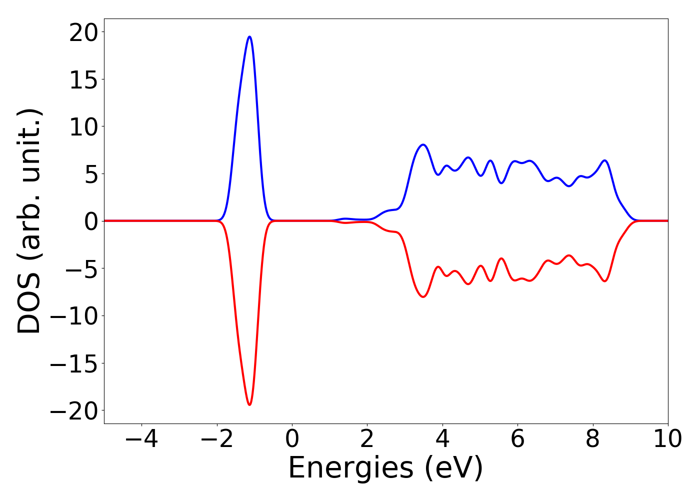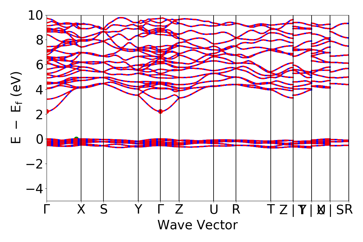 The following shows the electronic density of states and bandstructure [Source-code]. DFT is generally predicted to underestimate bandgap of materials. Accurate band-gaps are obtained with higher level methods (with high computational requirement) such as HSE, GW , which are under progress. If available, MBJ data should be comparable to experiments also. Total DOS, Orbital DOS and Element dos [Source-code] buttons are provided for density of states options. Energy is rescaled to make Fermi-energy zero. In the bandstructure plot [Source-code], spin up is shown with blue lines while spin down are shown with red lines. Non-degenerate spin-up and spin-down states (if applicable) would imply a net orbital magnetic moment in the system. Fermi-occupation tolerance for bandgap calculation is chosen as 0.001.