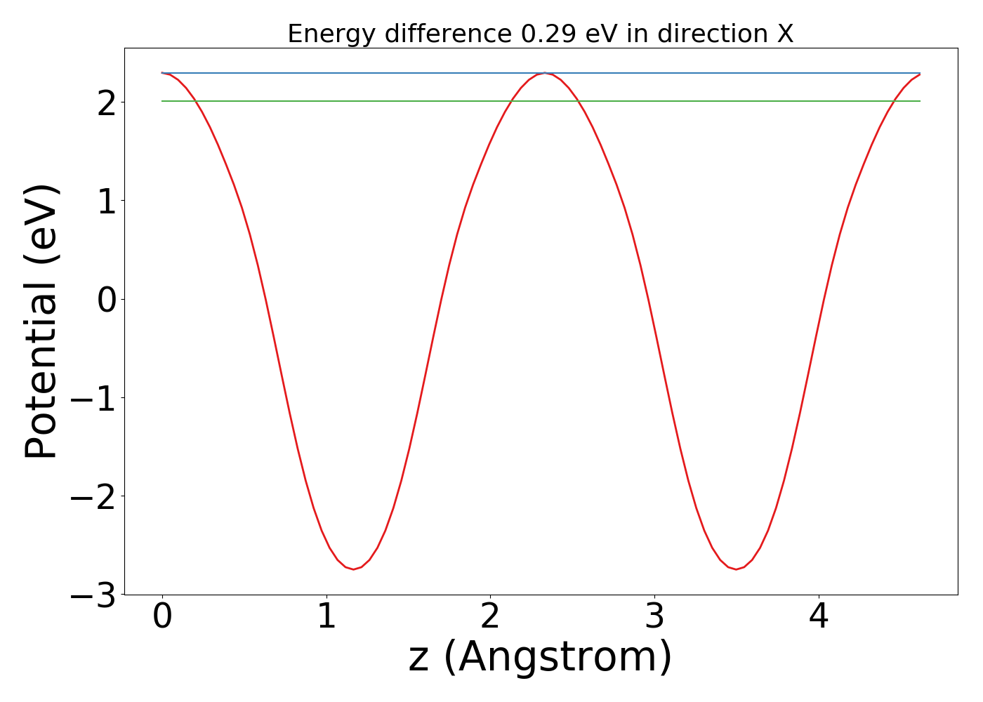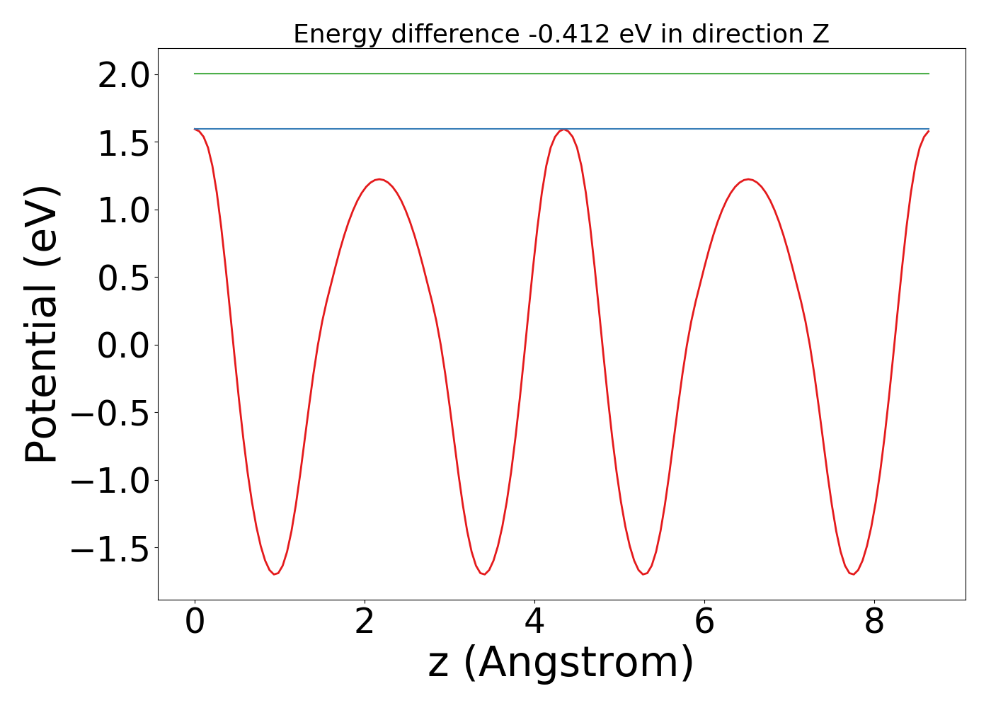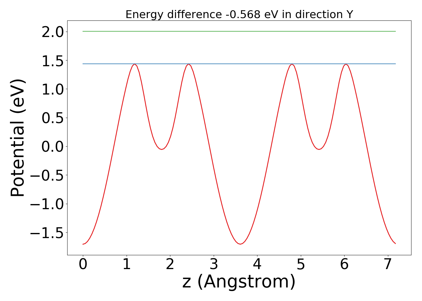 The following plot shows the plane averaged electrostatic potential (ionic+Hartree) along x, y and z-directions. The red line shows the Fermi-energy while the green line shows the maximum value of the electrostatic potential. For slab structures (with vacuum along z-direction), the difference in these two values can be used to calculate work-function of the material.
