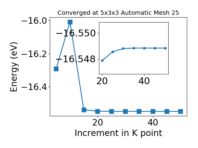 Calculations are done using VASP software [Source-code]. Convergence on KPOINTS [Source-code] and ENCUT [Source-code] is done with respect to total energy of the system within 0.001 eV tolerance. Please note convergence on KPOINTS and ENCUT is generally done for target properties, but here we assume energy-convergence with 0.001 eV should be sufficient for other properties also. The points on the curves are obtained with single-point calculation (number of ionic steps, NSW=1 ). However, for very accurate calculations, NSW>1 might be needed.